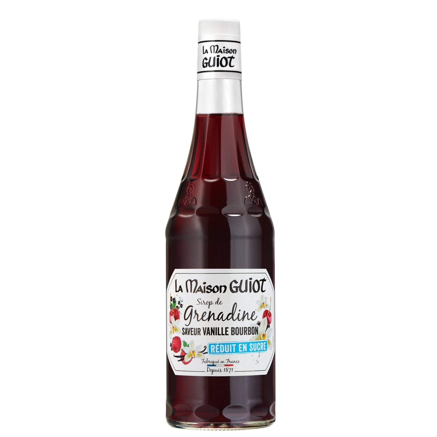 Rediscover the deliciousness of La Maison GUIOT Grenadine syrup boosted with Bourbon vanilla with 30% less sugar than in a classic syrup.
