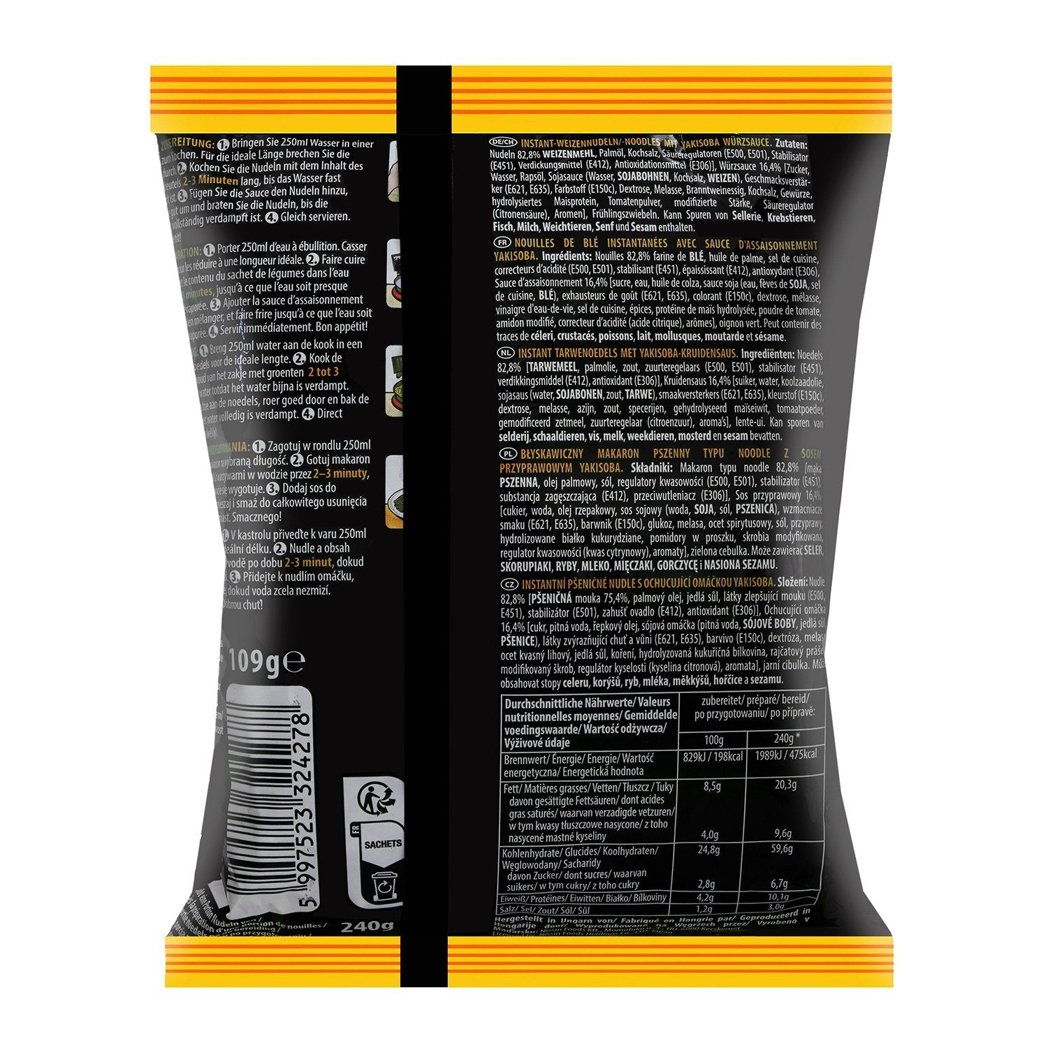 Noodles 82.8% WHEAT flour, palm oil, cooking salt, flour treatment agents (E500, E451), stabilizer (E501), thickener (E412), antioxidant (E306), Seasoning sauce 16.4% sugar, water, rapeseed oil, SOY sauce (water, SOYbeans, cooking salt, WHEAT), flavor enhancers (E621, E635), coloring (E150c), dextrose, molasses, brandy vinegar, cooking salt, spices, p…