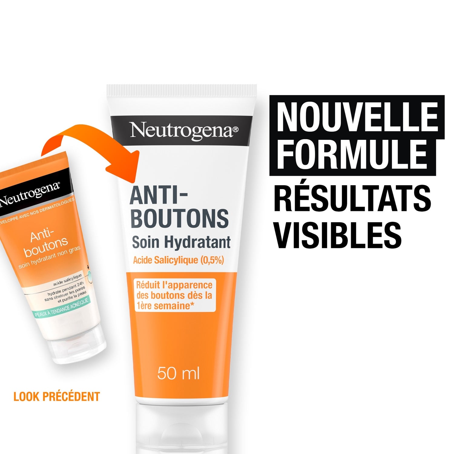 Neutrogena Spot-Relieving Moisturizer Developed with dermatologists, Neutrogena® Spot-Relieving Moisturizer is specially formulated for acne-prone skin. Formulated with 0.5% salicylic acid, this moisturizer provides instant and lasting 24-hour hydration while helping to prevent breakouts. Key Features: • Extended Moisture: Provides 24-hour hydration without clogging pores, for soft, well-hydrated skin. • Reduces Breakouts: Clinically proven to help reduce the appearance of breakouts in the first week*. • Gentle Formula: Formulated with chamomile and aloe vera, it soothes and respects the skin's natural balance. • Eco-Friendly: Contains 29% less plastic compared to previous packaging. Case and tube are fully recyclable. • Non-Greasy: Ideal for acne-prone skin, this moisturizer leaves no greasy residue. Directions for use: 1. Apply morning and evening to cleansed skin. 2. Massage gently until completely absorbed. Size: 50 ml. Made in France. Note: Avoid contact with eyes. In case of contact with eyes, rinse thoroughly. If irritation occurs, discontinue use immediately. *Clinical study on 31 subjects.