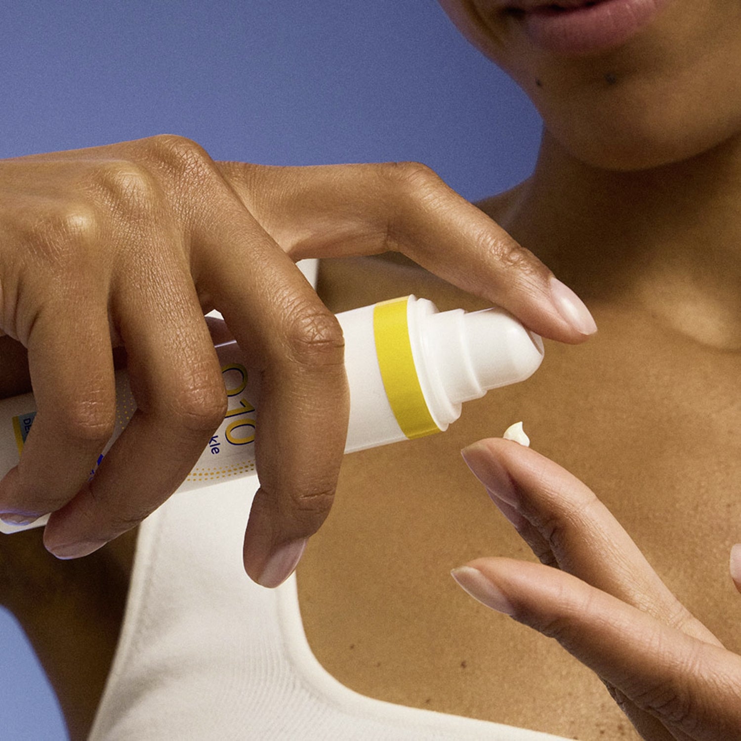 Q10 Daily Anti-UV Fluid Care with its triple anti-wrinkle defense protects against UV rays, prevents the effects of glycation and reduces wrinkles. Invisible on all skin tones - no white residue IMMEDIATELY: the skin appears hydrated, soft, smooth and protected FROM 2 WEEKS: 76% of users confirm a reduction in wrinkles and fine lines (self-assessment, 39 participants) FROM 4 WEEKS: The skin's defense mechanism is stimulated (instrumental test, 30 participants)