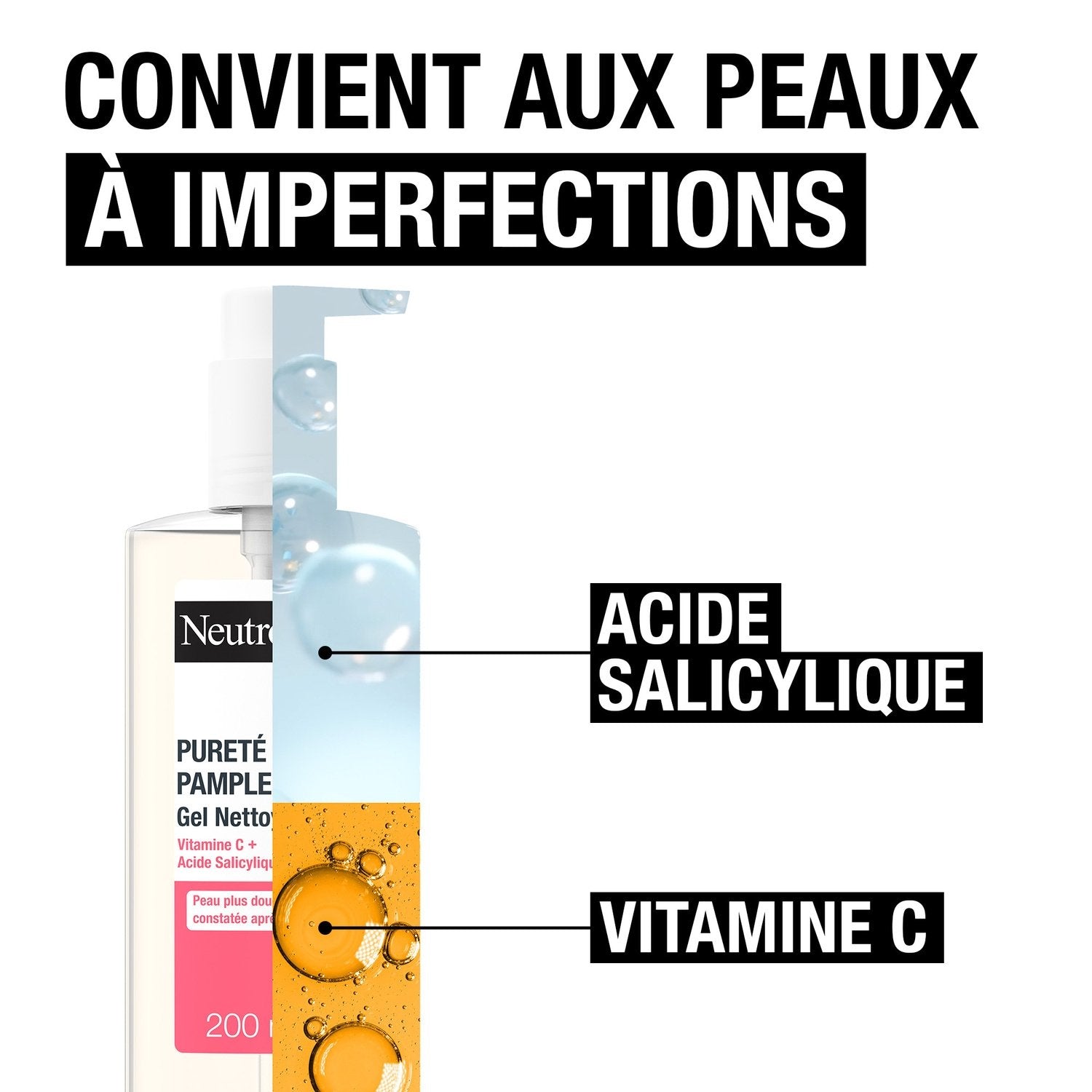 Neutrogena Purity Grapefruit Cleansing Gel Developed with dermatologists, Neutrogena Purity Grapefruit Cleansing Gel is enriched with vitamin C and 0.5% salicylic acid. This gentle cleanser is designed for blemish-prone skin, delivering a visibly clearer, more radiant complexion. With a pH of 4.5, this daily cleansing gel gently removes excess oil and impurities that dull the complexion, revealing cleansed, radiant skin. After one week of use, skin feels softer and smoother*. 82% of users reported a brighter complexion after 4 weeks*. Key Features: • Makes skin glow and removes excess oil and impurities • Contains vitamin C and 0.5% salicylic acid • Non-greasy • Bottle contains at least 50% recycled plastic (excluding label and pump) • Fully recyclable bottle • Made in Italy Directions for use: Use morning and evening. Massage onto a wet face, then rinse thoroughly. Avoid contact with eyes. In case of contact, rinse thoroughly. Size: 200 ml *Self-assessment on 67 volunteers. **Clinical study on 21 subjects.