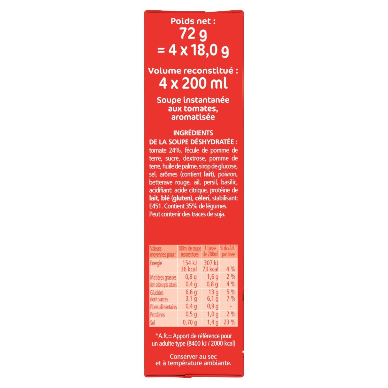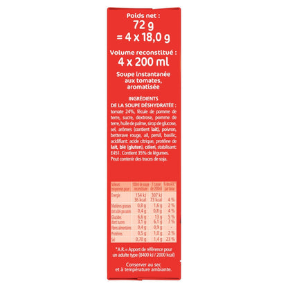 Ingredients of the dehydrated soup: tomato 24%, potato starch, sugar, dextrose, potato, palm oil, glucose syrup, salt, flavorings (contains MILK), pepper, yeast extract, beetroot, parsley, basil, acidifier: citric acid, MILK protein, WHEAT flour (GLUTEN), CELERY, stabilizer: E451.