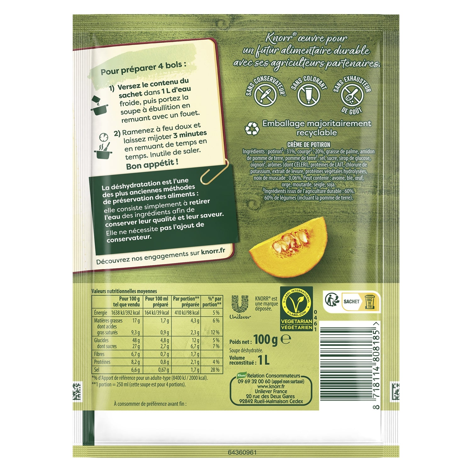 Discover the delicious Knorr ® Pumpkin Cream Soup, find all the sweetness of pumpkin in this dehydrated soup!,All the good taste of vegetables in these creamy Knorr® soups for the pleasure of young and old alike.,A soup prepared without coloring, preservatives or flavor enhancers.,But what is dehydration? It consists of removing the water from the ingredients of our soups in order to preserve their quality and flavor without adding preservatives.,This format allows you to make 4 generous bowls of vegetable soup.,A comforting soup recipe ready in 3 minutes: Boil 1 L of water, reduce heat to low and pour in the contents of the sachet. Simmer for 3 minutes. It's ready!