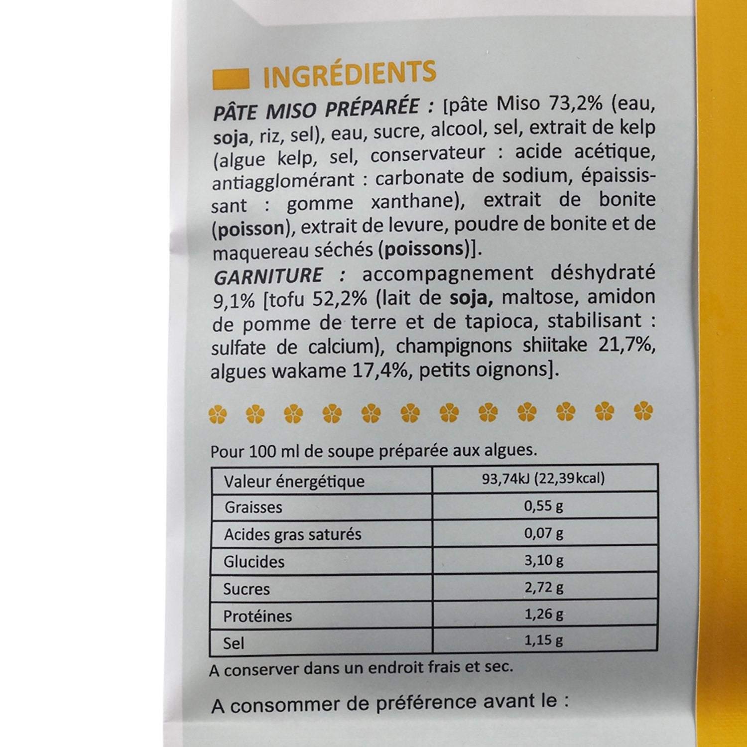 PREPARED MISO PASTE: Miso preparation 90.9% miso paste 74.9% (68.1% of the total product) (water, rice, SOYbeans, salt), water, alcohol, sugar, dried bonito powder (FISH), salt, brown seaweed extract (Saccharina japonica), yeast extract. FILLING: Dehydrated side dish 9.1% tofu 52.2% (4.8% of the total product) (SOYbean juice, stabilizer: calcium sulfate), shiitake mushrooms 21.7% (2% of the total product), wakame seaweed 17.4% (1.6% of the total product) (Undaria pinnatifida), pearl onions.