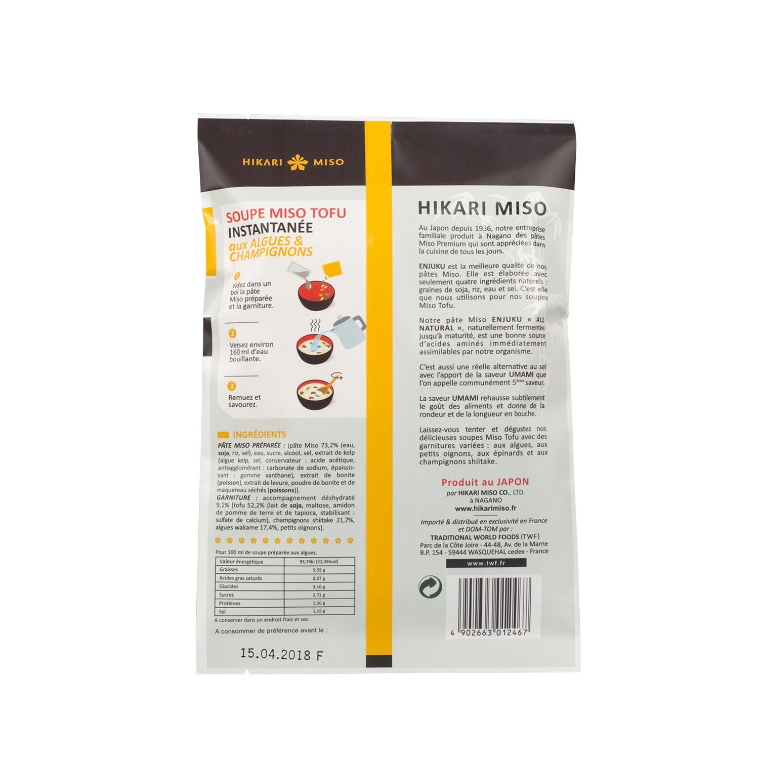 Ready in 1 minute, Hikari Miso Soup is an authentic Japanese miso soup, just like you'd find at a Japanese restaurant. This miso soup with diced tofu offers a healthy and tasty snack to enjoy throughout the day. This product contains 3 servings of miso soup.