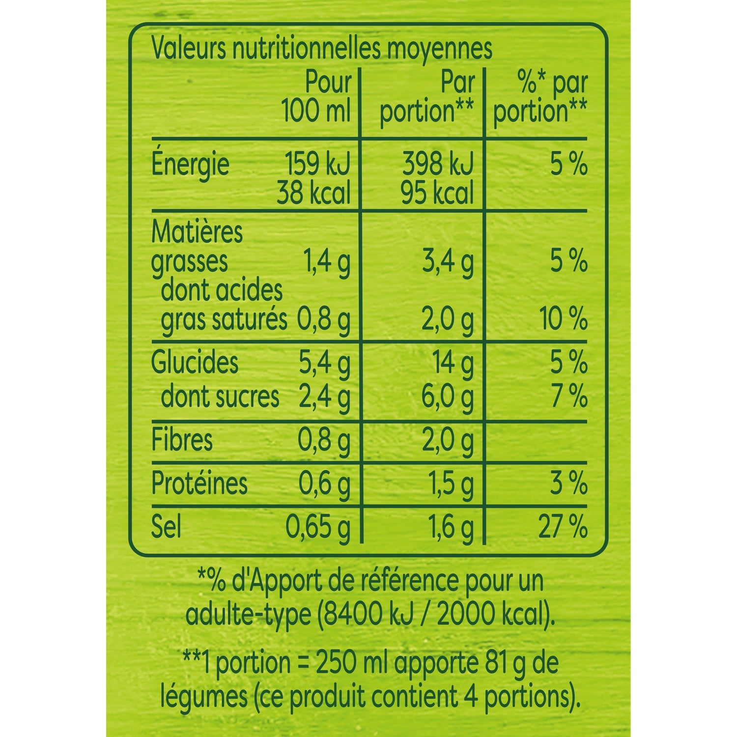 Energy value (kJ): 159 kJ / 100 mL | Energy value (kcal): 38 kcal / 100 mL | Fat: 1.4 g / 100 mL | Saturated fatty acids: 0.8 g / 100 mL