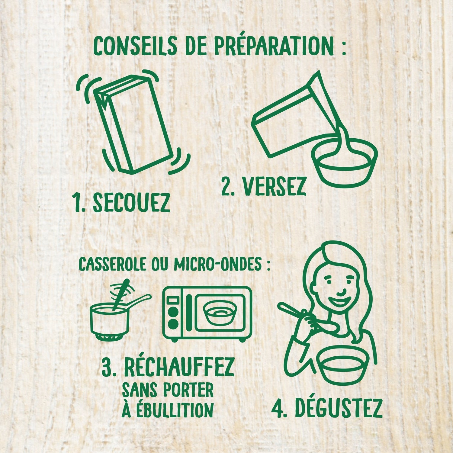 PREPARATION INSTRUCTIONS: 1. Shake 2. Pour 3. Heat without boiling Saucepan or microwave: 4. Enjoy NO NEED TO ADD SALT