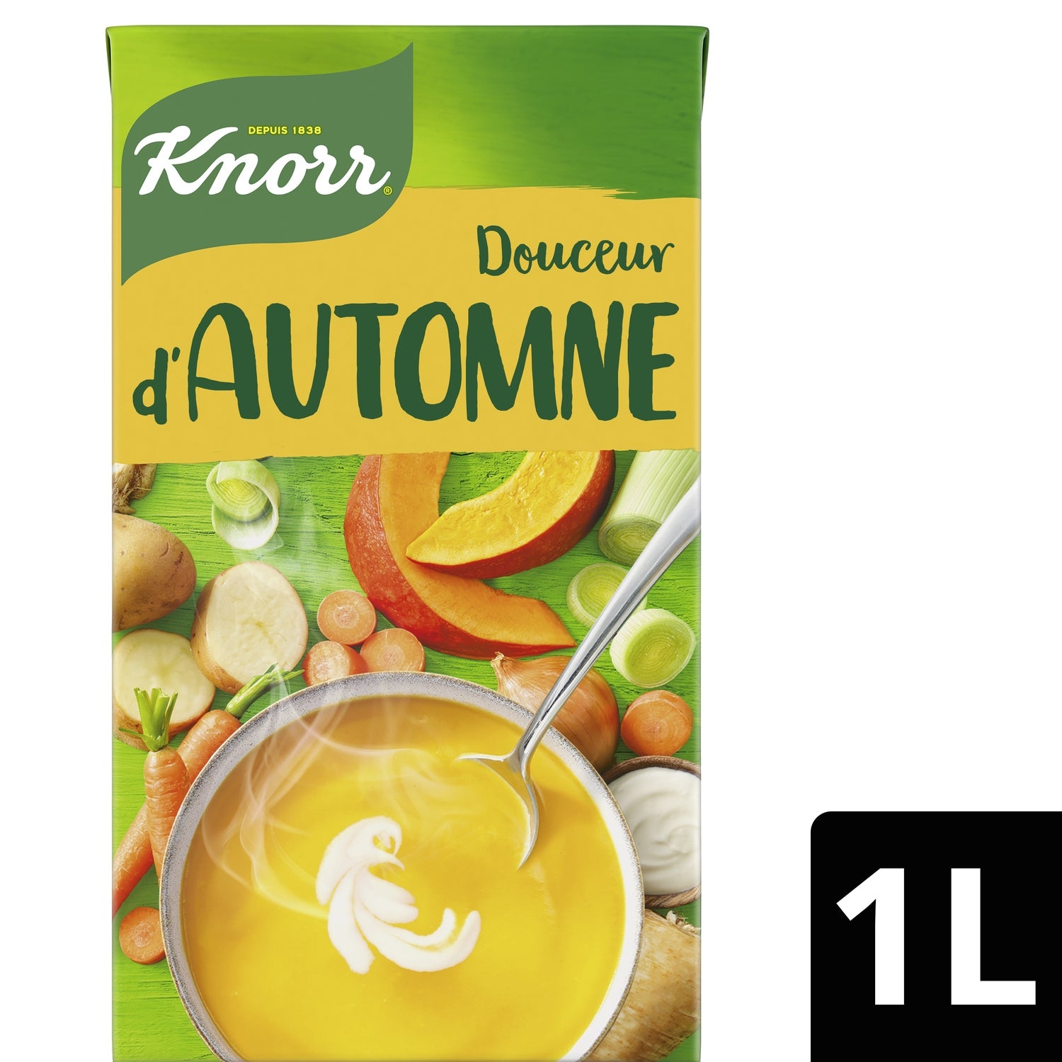 Discover Knorr® Autumn Sweetness Soup with sour cream, which combines the good taste of vegetables with the sweetness of sour cream, to offer you a deliciously indulgent moment.,A Nutri-score B soup cooked with 100% natural ingredients and vegetables from sustainable agriculture, for a simple meal rich in flavor.,This vegetarian soup rich in vegetables is prepared without flavor enhancers, colorings or preservatives (like all liquid soups in the ambient section).,Our soup cartons, mostly recyclable and certified by the FSC® and ASI® labels, support the sustainable sourcing of cardboard and aluminum.,This 1 L format allows you to serve 4 generous bowls of vegetable soup.,A comforting soup recipe, easy and quick to prepare: shake, pour, heat without boiling... and enjoy!