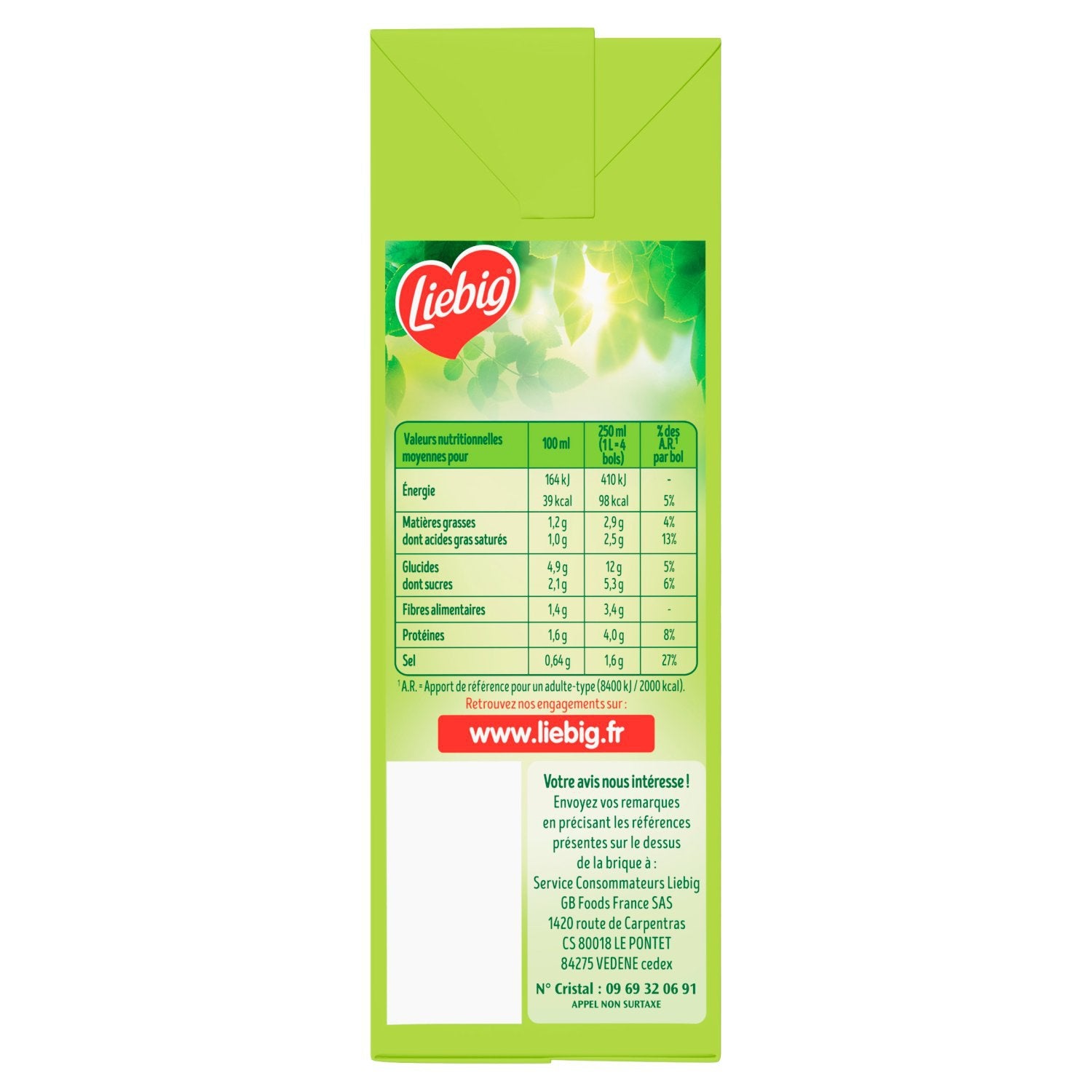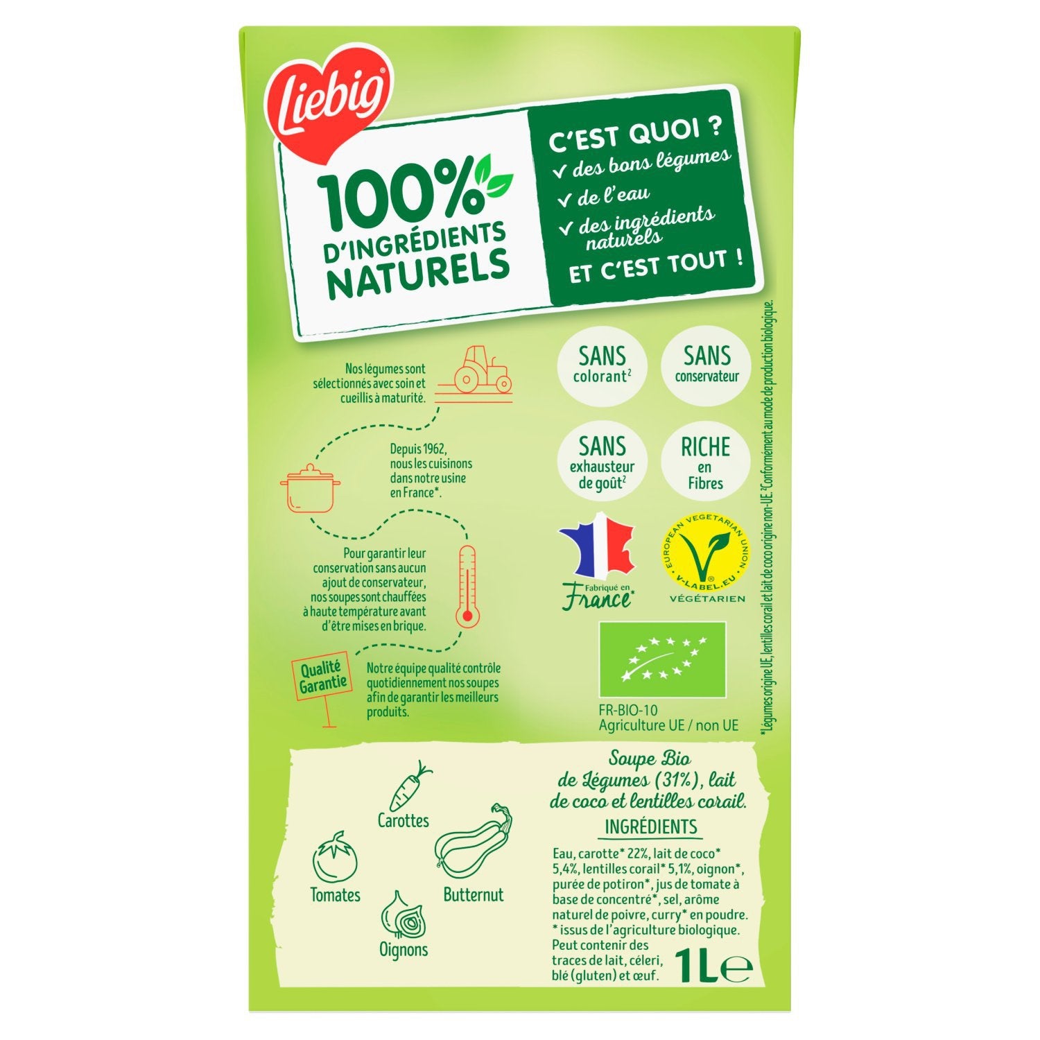 Treat yourself to Liebig Organic soups. These soups are made with 100% natural ingredients, without the use of synthetic pesticides, and using agriculture that respects biodiversity. Whether smooth or pureed, these soups have been lovingly prepared in our factory in France (EU-origin vegetables) since 1962 with 100% natural ingredients. Our vegetables are carefully selected and picked at their peak by our producers. To ensure their preservation without the addition of preservatives, our soups are heated to a high temperature before being packaged in cartons. Our quality team checks our soups daily to ensure the best products. Find these soups in 1L family cartons. Like all soups in the ambient section, Liebig is the inventor of the carton soup, a packaging that preserves the quality of vegetables for several months without the addition of preservatives. This Liebig recipe is made in our factory near Avignon in Provence. Our local teams are committed to offering you quality products made with carefully grown vegetables harvested at their peak. For more information about our history or our recipes, visit www.liebig.fr