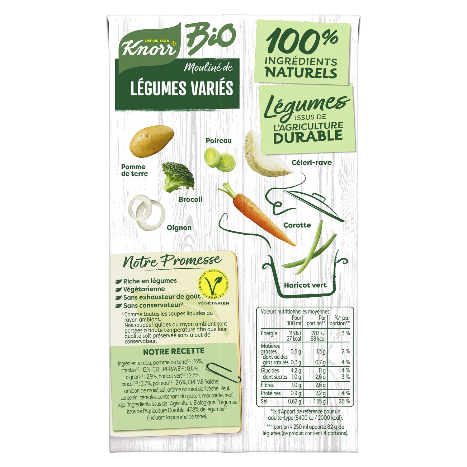 Find all the good taste of organic vegetables in this delicious Knorr® organic mixed vegetable puree soup with a round and pulpy texture. A treat!,At Knorr ®, we are convinced that nature is our most precious asset. That's why we have developed a range of soups with vegetables from organic farming.,This Nutri-score B and vegetarian soup is rich in vegetables, prepared without flavor enhancers or preservatives (like all liquid soups in the ambient aisle).,Our soup cartons, mostly recyclable and certified by the FSC® and ASI® labels, support the sustainable sourcing of cardboard and aluminum.,This 1 L format allows you to make 4 generous bowls of soup.,A comforting soup recipe that is easy and quick to prepare: shake, pour, heat without boiling... and enjoy!