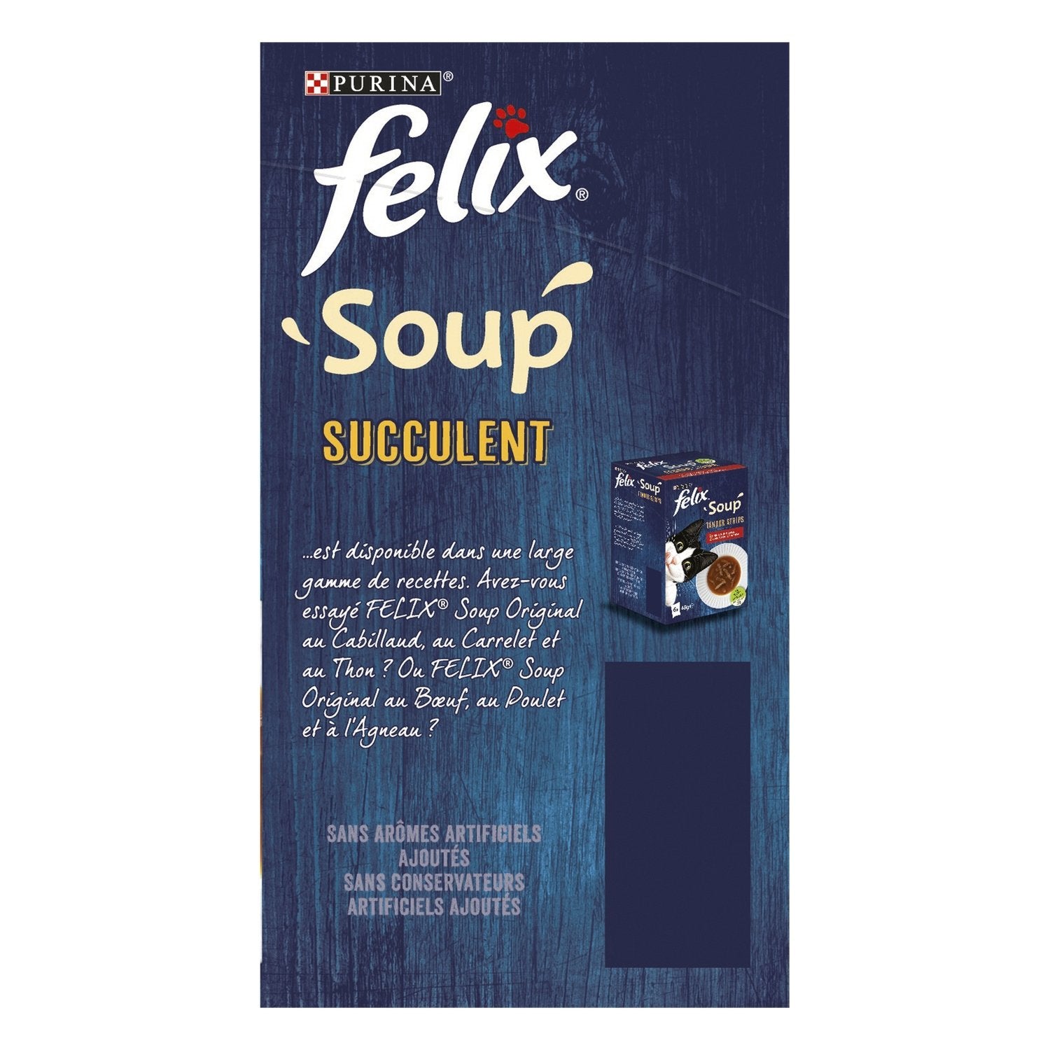 Complementary food for adult cats,No artificial colors, so irresistible!,Prepared with quality ingredients,No added artificial flavors,No added artificial preservatives,FELIX® Soup Succulent is a range of irresistible recipes for your cat.,Different ranges available. A practical freshness pouch for better portion control