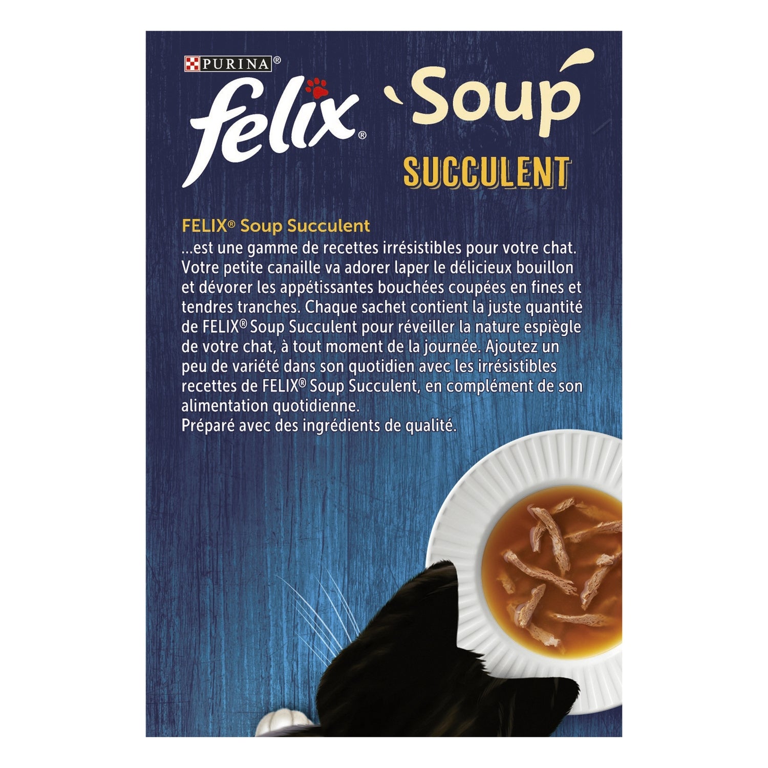 FELIX Soup Succulent is a range of irresistible recipes for your cat. Your little rascal will love lapping up the delicious broth and devouring the mouthwatering bites cut into thin, tender slices. Each pouch contains just the right amount of FELIX Soup Succulent to awaken your cat's playful nature, at any time of day. Add a little variety to your cat's daily routine with the irresistible FELIX Soup Succulent recipes, as a complement to their daily diet.