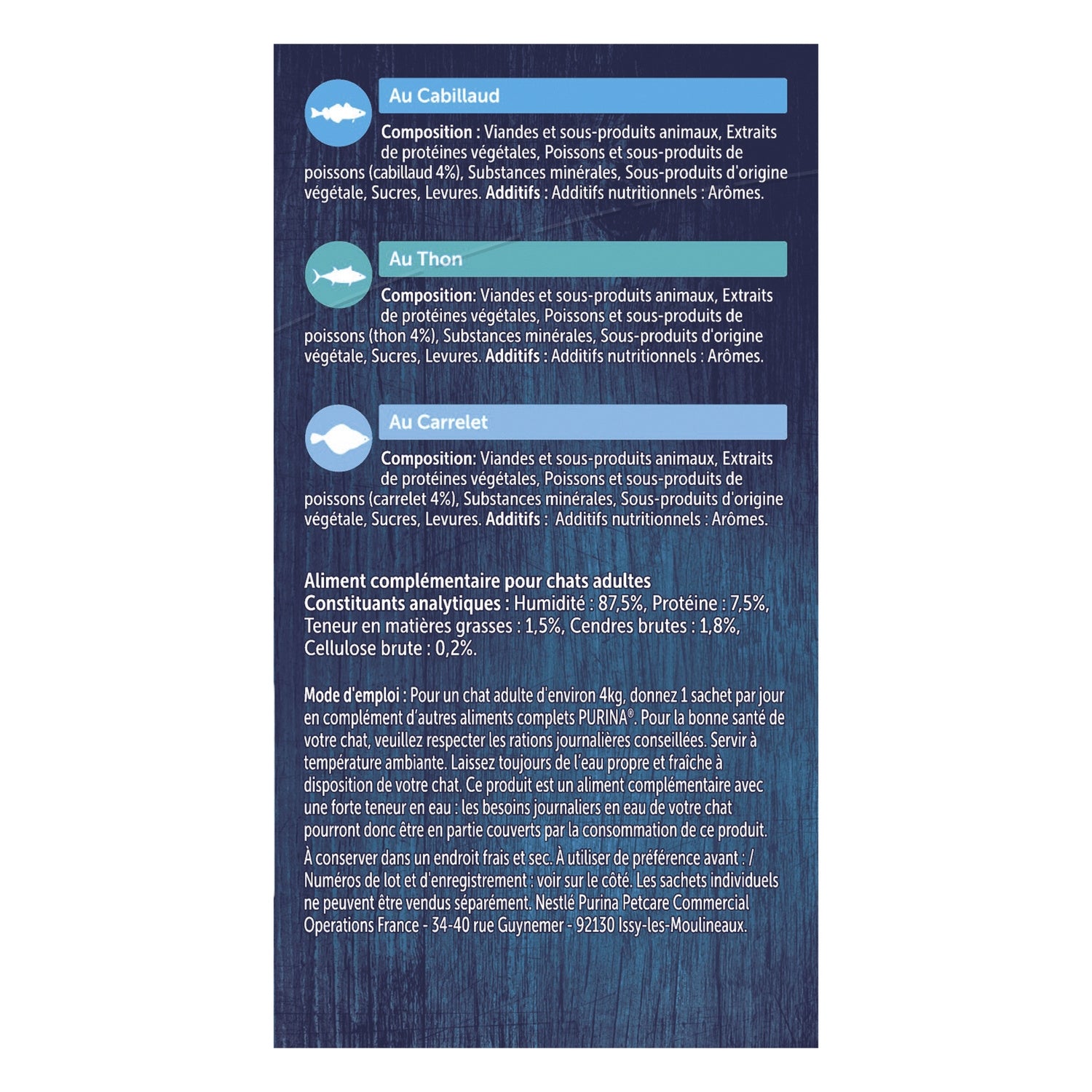 Composition: Cod: Composition: Meat and animal by-products, Vegetable protein extracts, FISH and FISH by-products (cod 4%), Mineral substances, By-products of vegetable origin, Sugars, Yeasts. Plaice: Composition: Meat and animal by-products, Vegetable protein extracts, FISH and FISH by-products (plaice 4%), Mineral substances, By-products of vegetable origin, Sugars, Yeasts. Tuna: Composition: Meat and animal by-products, Vegetable protein extracts, FISH and FISH by-products (tuna 4%), Mineral substances, By-products of vegetable origin, Sugars, Yeasts.