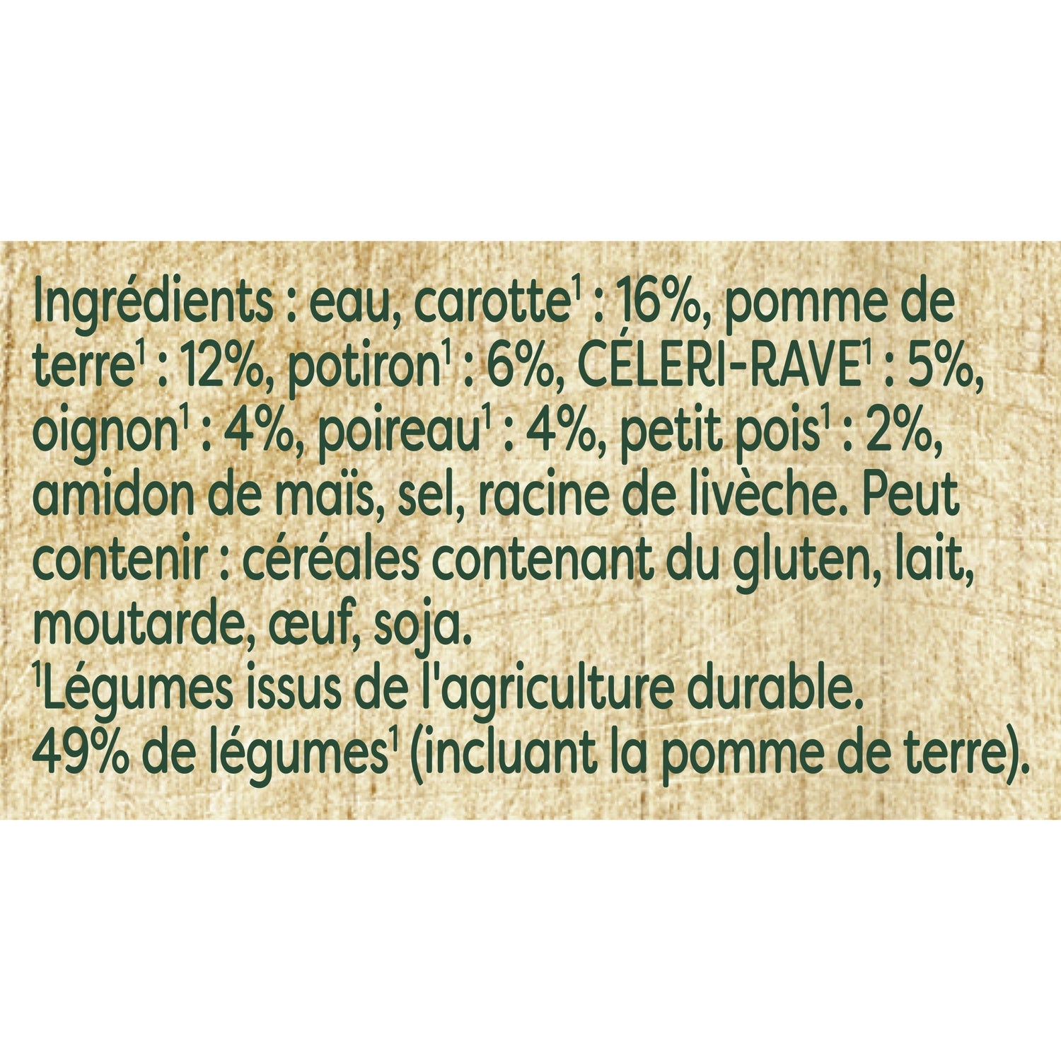 OUR RECIPE Ingredients: water, carrot¹: 16%, potato¹: 12%, pumpkin¹: 6%, celeriac¹: 5%, onion¹: 4%, leek¹: 4%, pea¹: 2%, corn starch, salt, lovage root. May contain: cereals containing gluten, milk, mustard, egg, soy. ¹Vegetables from sustainable agriculture. 49% vegetables¹ (including potato).