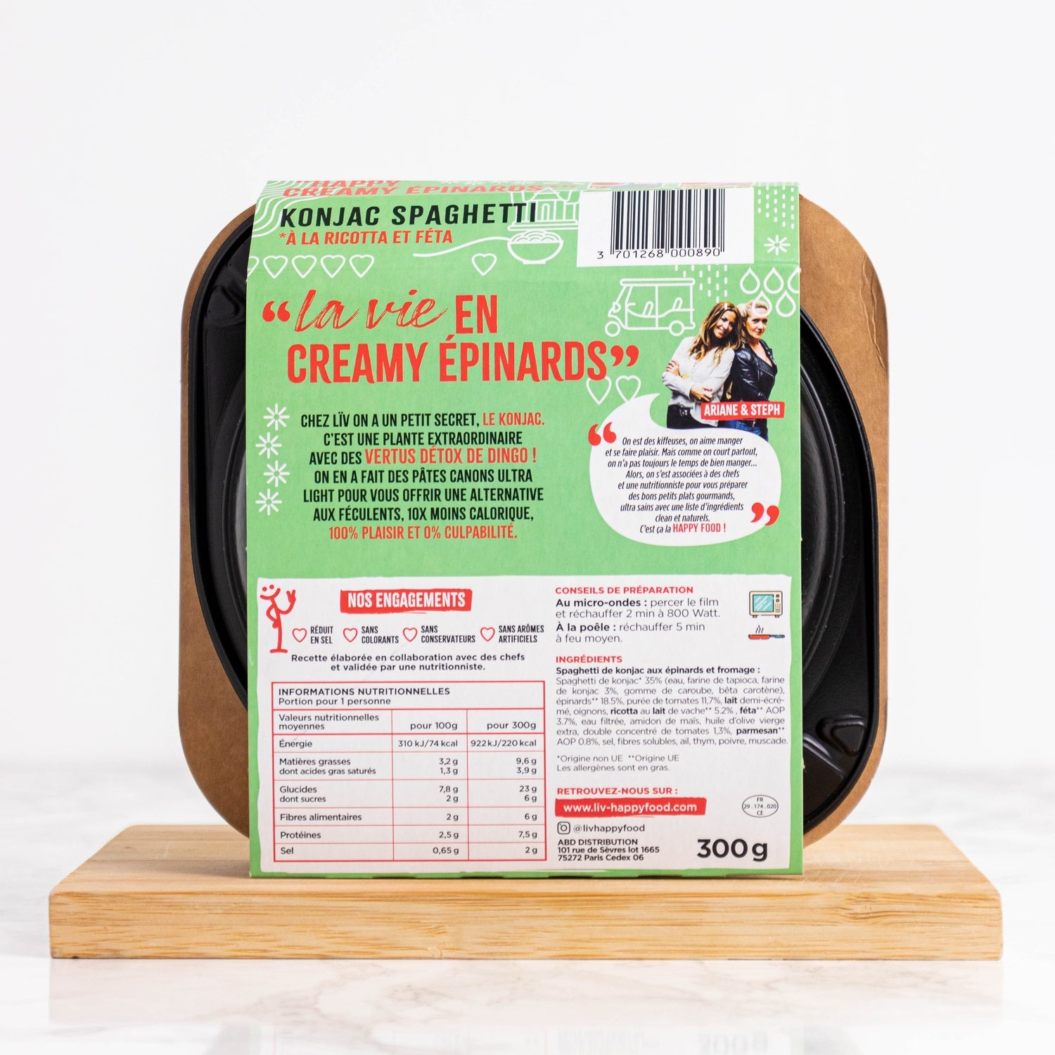 Konjac spaghetti* 35% (water, tapioca flour, konjac flour 3%, locust bean gum, beta carotene), spinach** 18.5%, tomato puree, semi-skimmed MILK, onions, cow's MILK ricotta** 5.2%, feta** PDO 3.7%, filtered water, corn starch, extra virgin olive oil, double tomato concentrate, parmesan** PDO 0.8%, salt, soluble fiber, garlic, thyme, pepper, nutmeg.