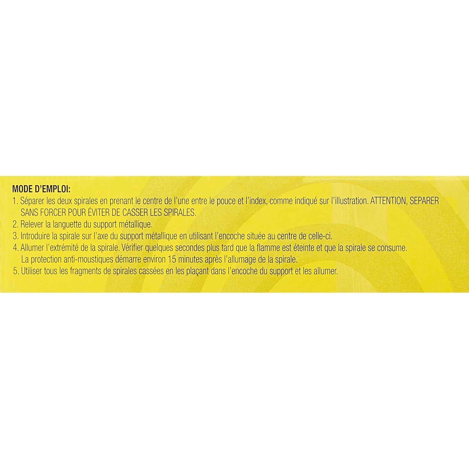Separate the two coils by taking the center of one between your thumb and forefinger, as shown in the illustration. Be careful not to force the coils apart to avoid breaking them. Lift the tab on the metal support. Insert the coil onto the axis of the metal support using the notch in its center. Light the end of the coil. Check a few seconds later that the flame is extinguished and that the coil is burning. Mosquito protection starts approximately 15 minutes after lighting the coil. Use all the broken coil fragments by placing them in the notch on the support and lighting them.