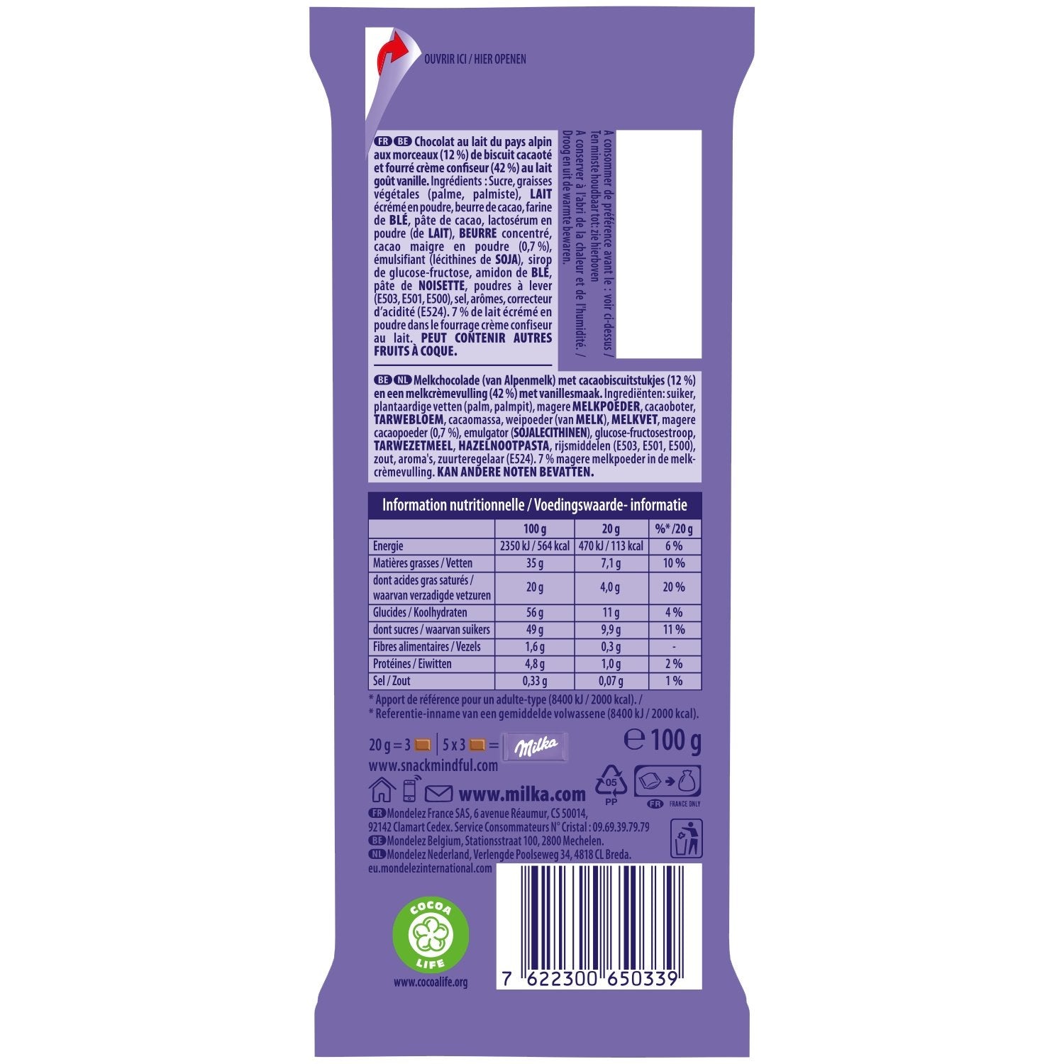 Milk chocolate from the Alpine region with pieces (12%) of cocoa biscuit and filled with confectioner's cream (42%) with vanilla-flavored milk.