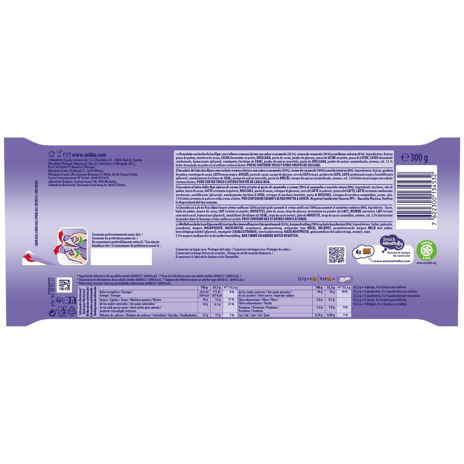 Discover Milka Mmmax Caramel and Whole Hazelnuts! In each square, a whole hazelnut and a delicious milk confectioner's cream are topped with a melting caramel coulis and coated in delicious Milka milk chocolate. From the very first Milka bar produced to the last one to leave our factories, Milka owes its timeless taste to the perfect blend of quality ingredients. We use 100% Alpine milk and sustainable cocoa thanks to our Cocoa Life program. You can feel all the care put into this combination every time a Milka square melts on your tongue.