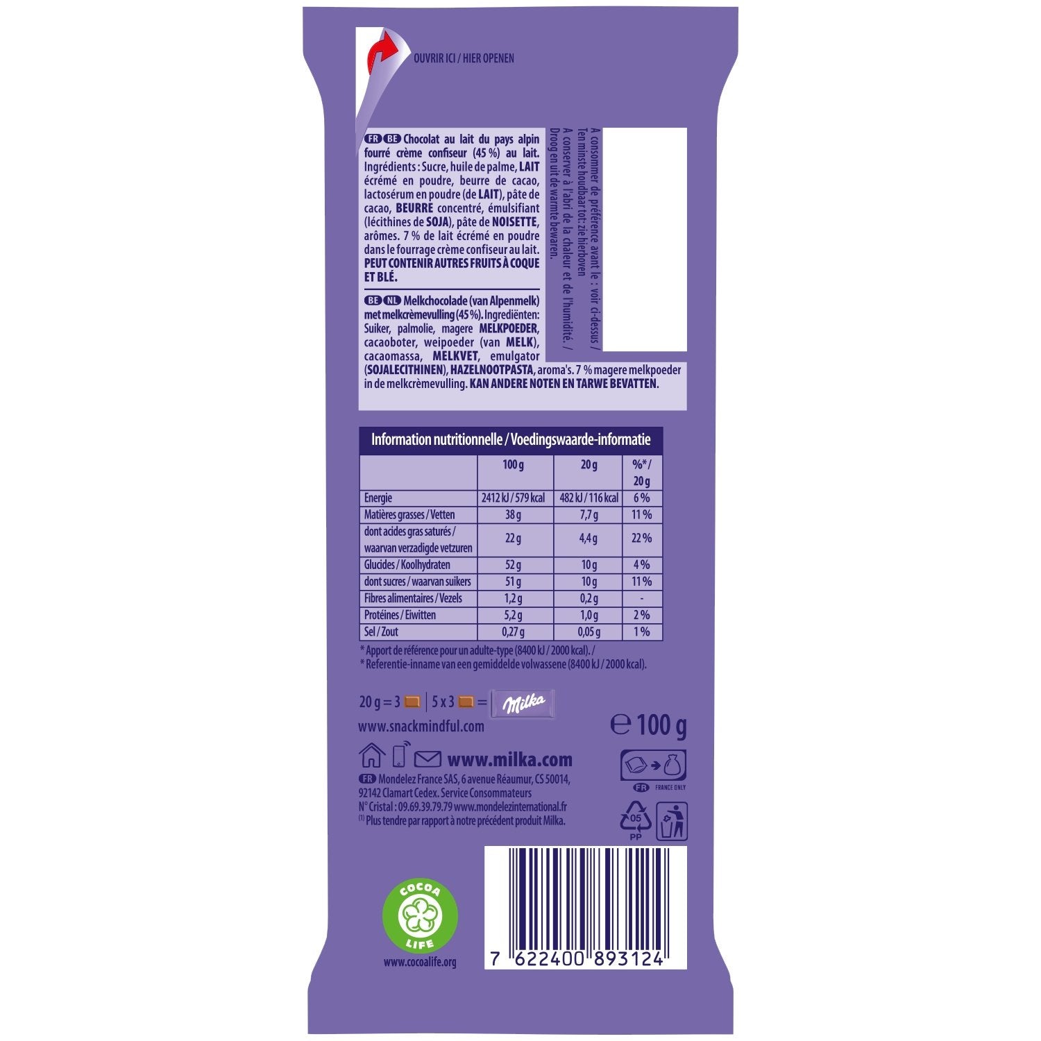 Milk chocolate from the Alpine region filled with confectioner's cream (45%) with milk.