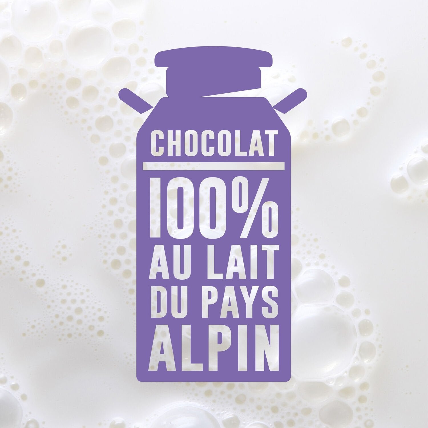 White milk chocolate from the Alpine region filled (40%) with vanilla-flavored milk confectionery cream and cocoa biscuit pieces (12%).