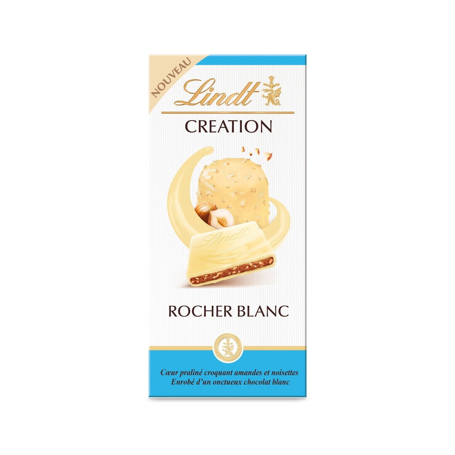 Discover Lindt CREATION Rocher Blanc: the irresistible softness of almond and hazelnut praline, combined with the crunchiness of caramelized hazelnuts, in the heart of smooth Lindt white chocolate.