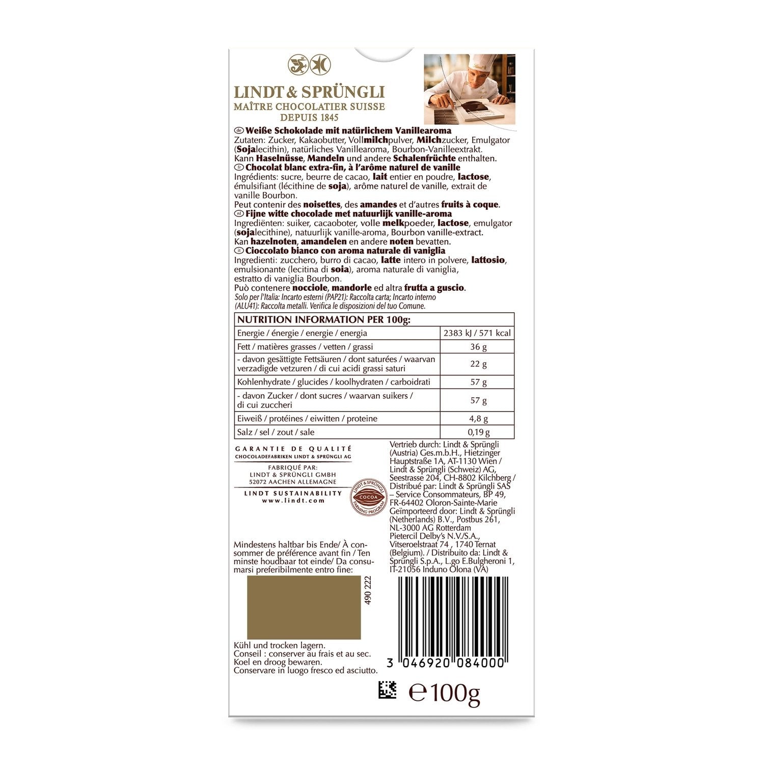 extra fine white chocolate with natural vanilla flavor
