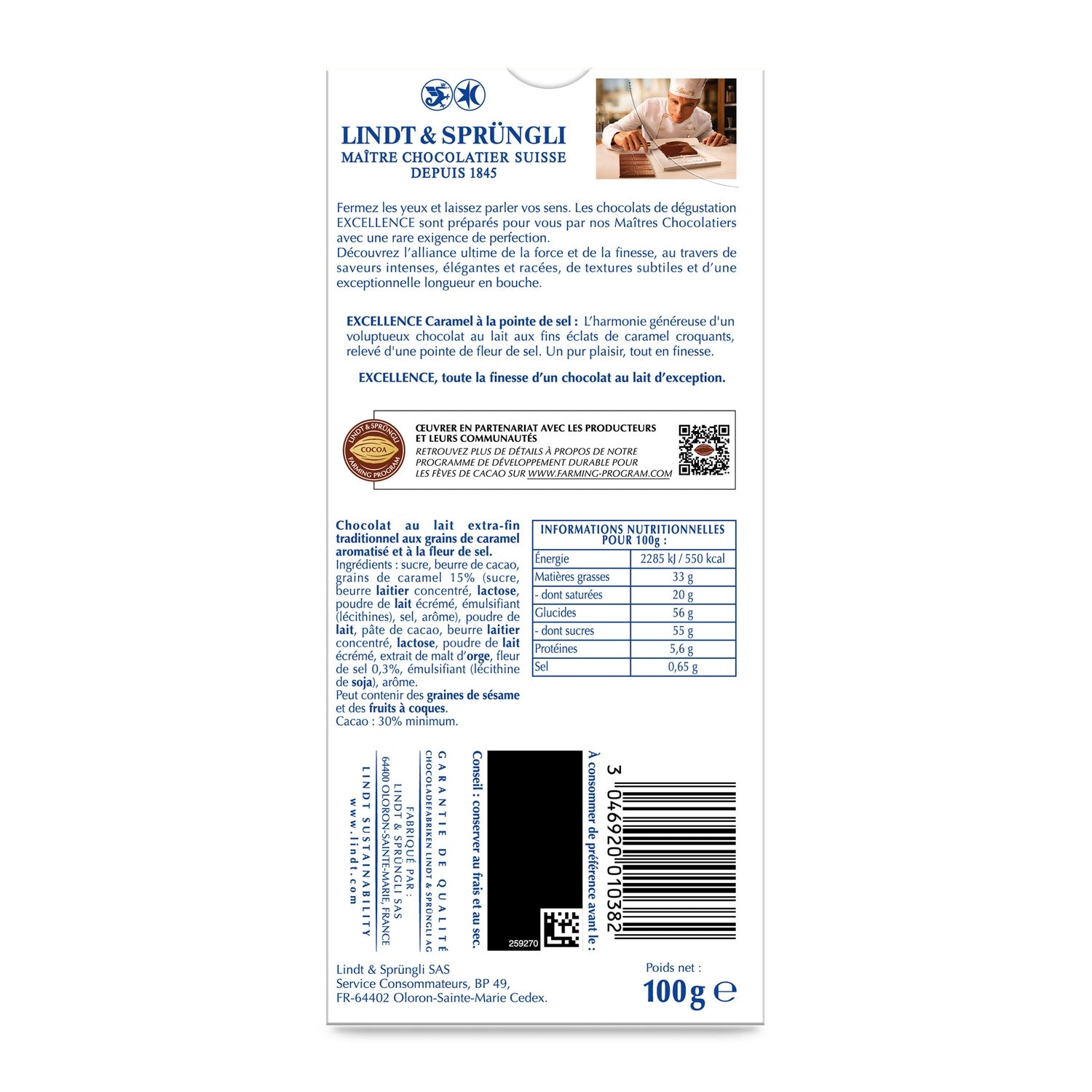Close your eyes and discover the finest of pleasures. Lindt Excellence tasting chocolates are prepared for you by our Maîtres Chocolatiers with a rare demand for perfection: from the selection of the beans to the revelation of the finest flavors and textures of chocolate. Discover a new tasting pleasure: the generous harmony of voluptuous milk chocolate with fine, crunchy caramel pieces, enhanced with a hint of fleur de sel. A pure pleasure, all in finesse.