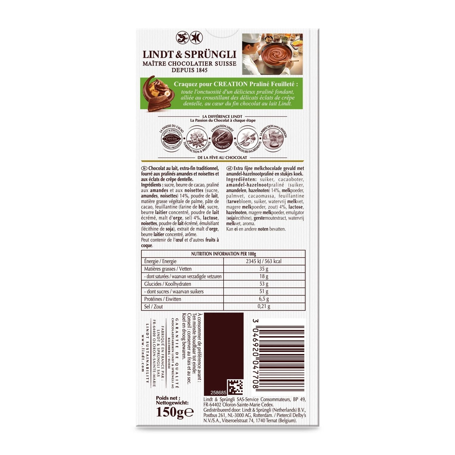 Succumb to Lindt CREATION Praliné Feuilleté: All the smoothness of a delicious melting praline, combined with the crunchiness of delicate Crêpe Dentelle shards, in the heart of fine Lindt milk chocolate.