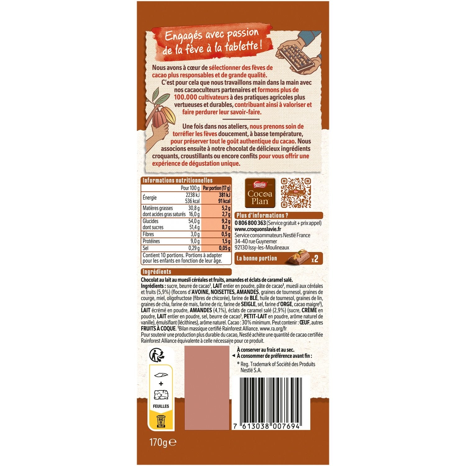 Ingredients: sugar, cocoa butter¹, whole MILK powder, cocoa mass¹, muesli with cereals and fruits (5.9%) (OAT flakes, HAZELNUTS, ALMONDS, sunflower seeds, pumpkin seeds, honey, oligofructose (chicory fiber), WHEAT flour, sunflower oil, flax seeds, chia seeds, corn flour, rice flour, RYE flour, salt, BARLEY flour, fat-reduced cocoa¹), skimmed MILK powder, ALMONDS (4.1%), salted caramel pieces (2.9%) (sugar, CREAM powder, whole MILK powder, salt, cocoa butter¹, WHEY powder, natural vanilla flavoring), emulsifier (lecithins), natural flavoring. Cocoa solids: 30% minimum. May contain: EGG, other NUTS. ¹Rainforest Alliance certified mass balance. www.ra.org/fr.