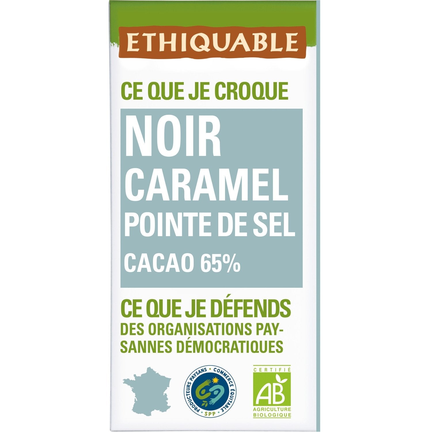 WHAT I'M BITE-ING: Crunchy dark chocolate with caramel chips and a hint of salt. A 65% cocoa dark chocolate combining a dual origin from Peru and Haiti for an elegant and aromatic chocolatey treat. Made in France in our 100% organic and fair-trade chocolate factory in Gers. Chocolate-making expertise. We work in the field with producers from the SOL Y CAFE and NORANDINO cooperatives in Peru and FECCANO in Haiti, to implement impactful fair trade projects.
