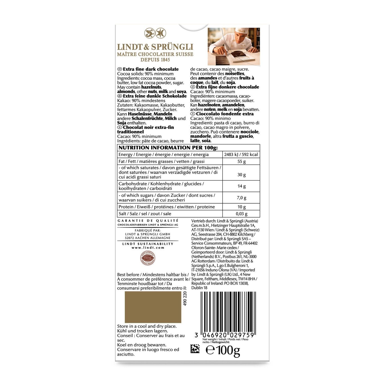 Lindt Excellence Dark Chocolate Bar 90% cocoa, the intensity of premium dark chocolate with powerful cocoa notes. Treat your senses to an extra-fine chocolate exceptionally rich in cocoa. Since the 1980s, Lindt has been constantly perfecting the art of quality dark chocolate. Prepared using the finest ingredients and sustainably sourced cocoa beans.
