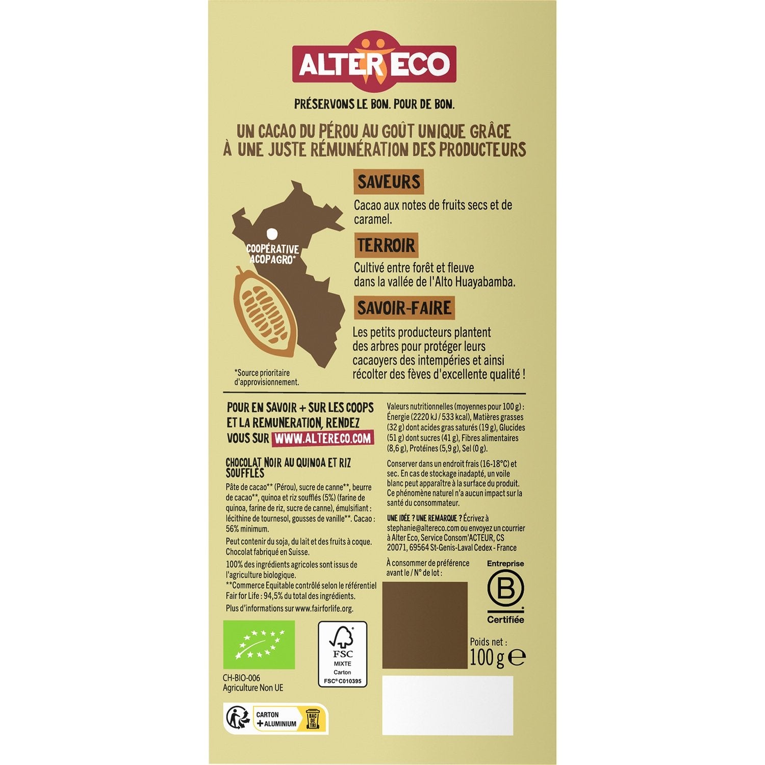 Discover Alter Eco's 60% cocoa puffed quinoa dark chocolate and let yourself be carried away by its fruity aromas and the lightness of quinoa. Organic and fair trade, it's the ideal chocolate bar for more responsible consumption from breakfast to afternoon tea.