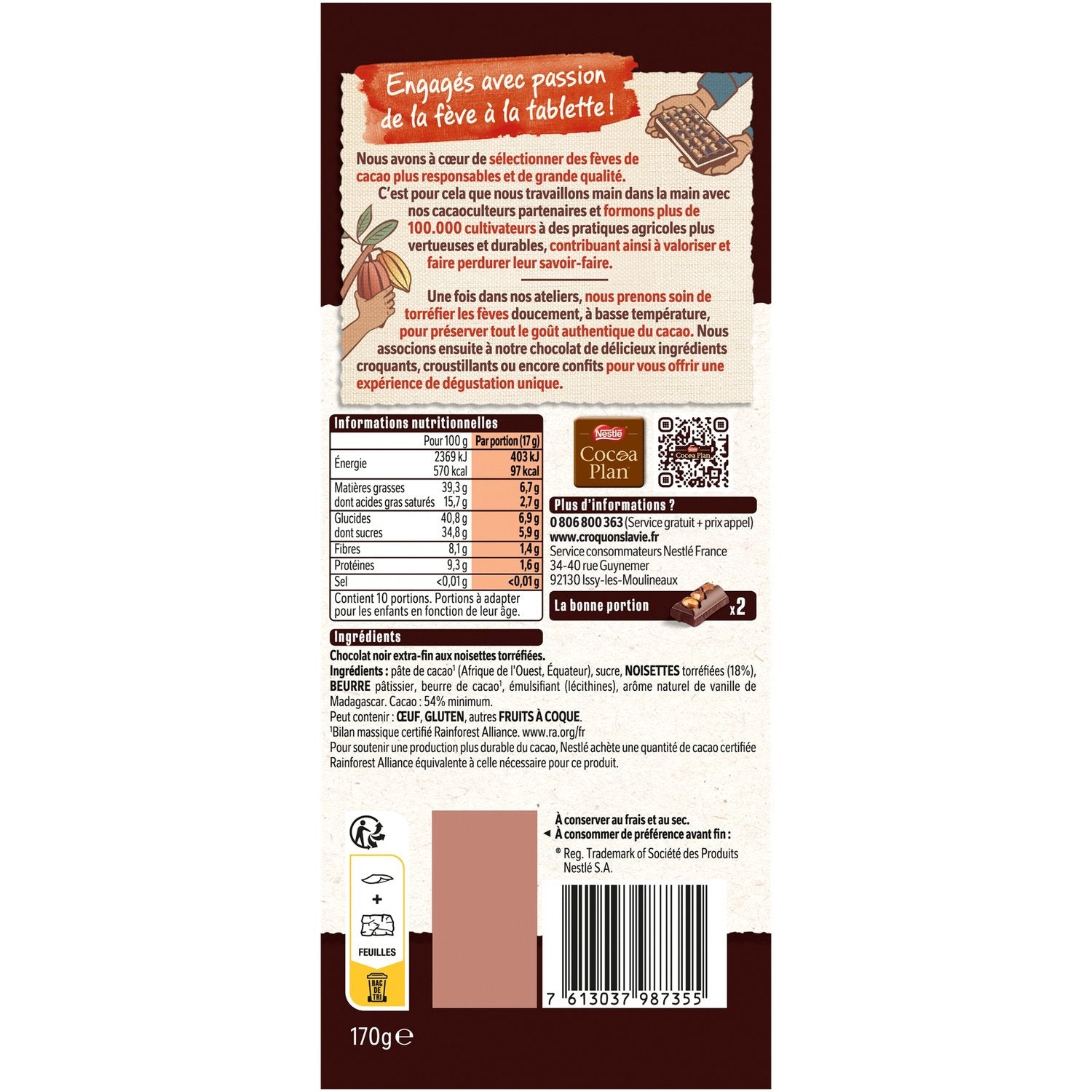Ingredients: cocoa mass¹ (West Africa, Ecuador), sugar, roasted HAZELNUTS (18%), baking BUTTER, cocoa butter¹, emulsifier (lecithins), natural Madagascar vanilla flavoring. Cocoa: 54% minimum. May contain: EGG, GLUTEN, other NUTS. ¹Rainforest Alliance certified mass balance. www.ra.org/fr.