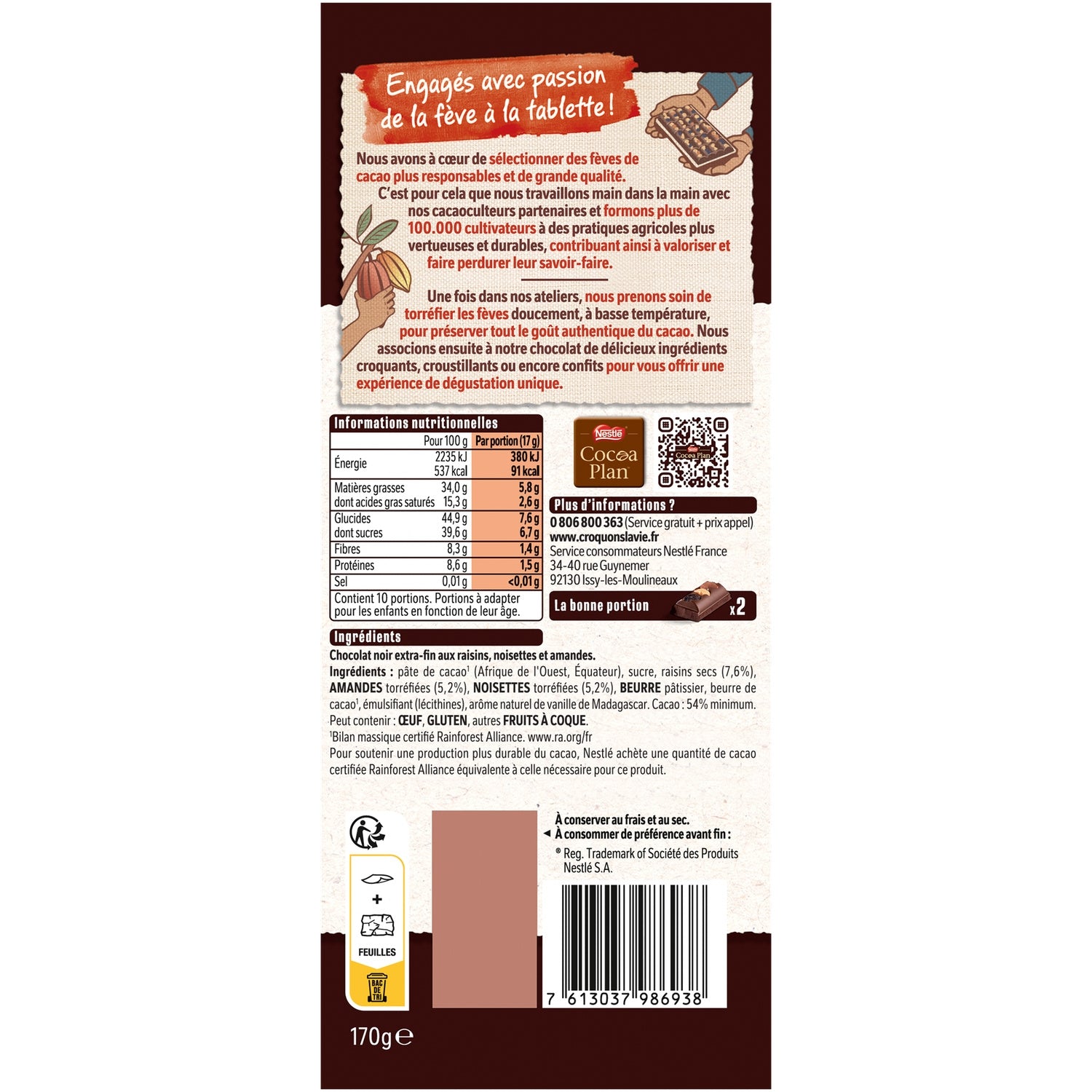 Ingredients: cocoa mass¹ (West Africa, Ecuador), sugar, raisins (7.6%), roasted ALMONDS (5.2%), roasted HAZELNUTS (5.2%), baking BUTTER, cocoa butter¹, emulsifier (lecithins), natural Madagascar vanilla flavoring. Cocoa: 54% minimum. May contain: EGG, GLUTEN, other NUTS. ¹Rainforest Alliance certified mass balance. www.ra.org/fr.