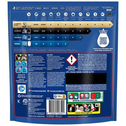With Finish Quantum All in One, get a deep clean and brilliant shine the first time, every time! Its three-chamber capsule technology removes all types of food residue - without the need to pre-wash your dishes. The powder and gel work to remove scale and residue. The powerball protects glassware and helps keep your dishes sparkling. All this with 25% (by weight) fewer chemicals than our Finish Power tablets. Finish is the #1 recommended brand* by leading dishwasher brands. Thanks to our expertise, leading dishwasher brands trust and recommend us. *Finish is the #1 recommended detergent based on market share of dishwasher manufacturers who recommend Finish.