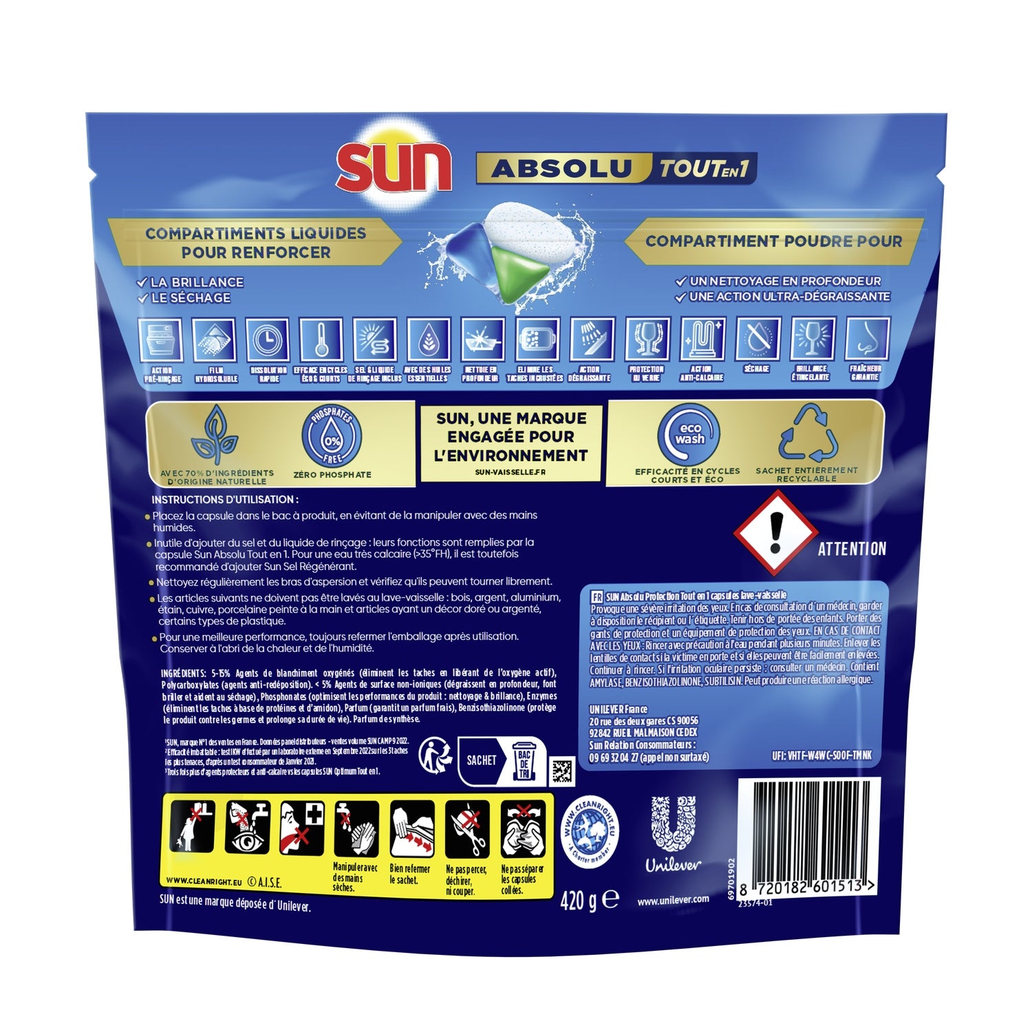 With Sun, discover the ultimate in efficiency: unbeatable performance on tough stains* and a unique sensory experience with a fresh fragrance composed of essential oils with notes of citrus and peach. The new Sun Absolu All-in-1 Protection dishwasher tablets combine the best of powder for deep cleaning and ultra-degreasing action, with the best of gel for perfectly dry and shiny dishes! A unique combination of protective and anti-limescale agents, our bi-textured Absolu Protection capsule protects your dishes and your dishwasher. A complete solution in a single dishwasher product that performs the functions of detergent, rinse aid, and regenerating salt. This capsule offers both exceptional performance and a phosphate-free formula with 70% ingredients of natural origin. Our dishwasher tablets are effective in "eco" and short cycles thanks to their rapid dissolution. They therefore allow for reduced energy and water consumption. No need to pre-rinse: our dishwasher capsule provides this function and also guarantees real protection for your dishes and dishwasher wash after wash. Directions for use: simply place the tablet in the detergent drawer without adding salt or rinse aid, avoiding handling it with wet hands. With very hard water (>35°fH), however, it is recommended to add Sun Regenerating Salt. All you have to do is go back to enjoying the rest of your day, our Sun Absolute All-in-1 Protection capsule will take care of the rest! ¹ Results 3 x more protective and anti-limescale agents vs. SUN Optimum All-in-1 capsules. * Unbeatable effectiveness: test carried out by an external laboratory in September 2022 on the 3 most stubborn stains, based on a consumer test from January 2021.