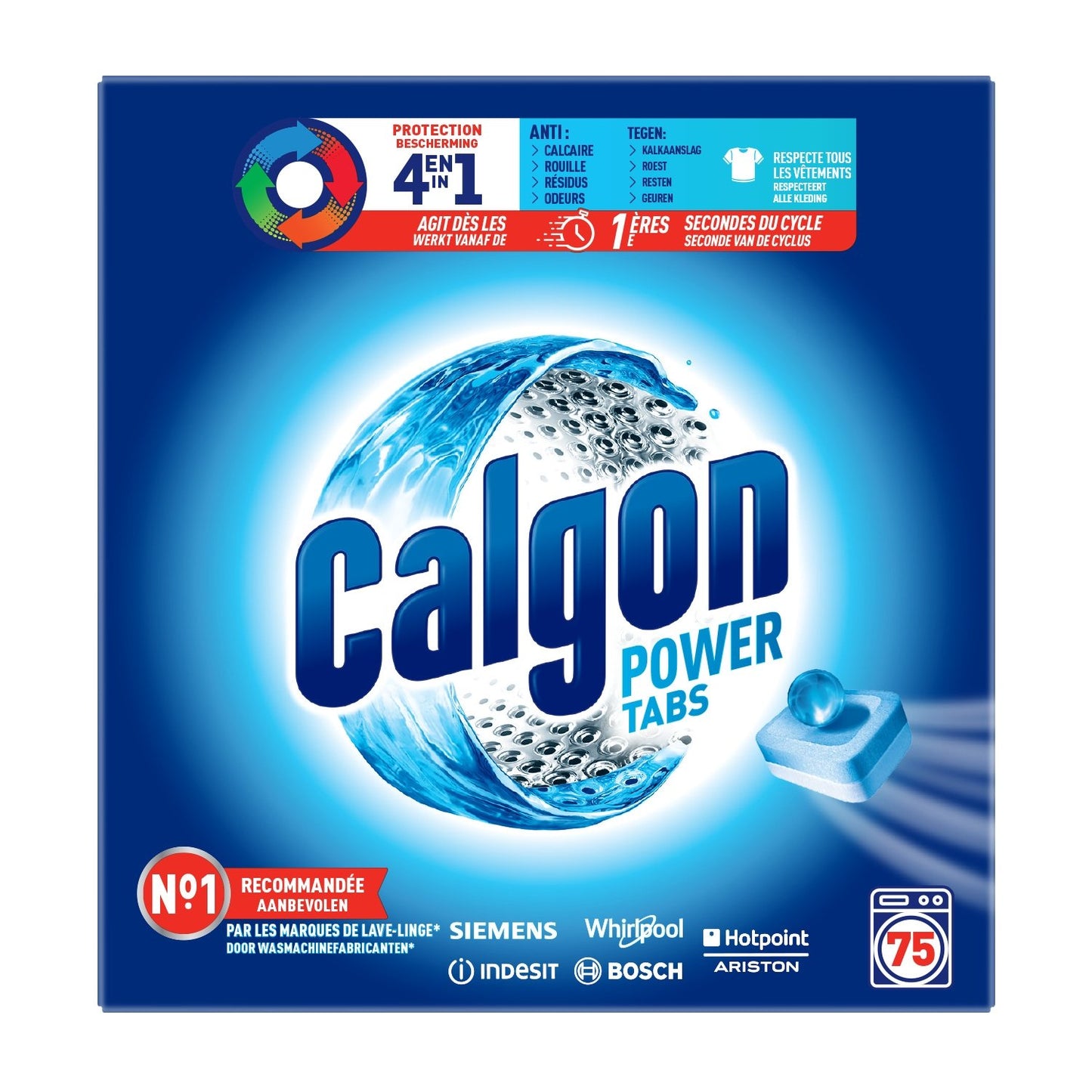 Only Calgon tabs have such a high concentration of active anti-limescale agents, contained in the blue and white layers of the tablet. Throughout the wash cycle, the tabs dissolve quickly and completely, ensuring maximum effectiveness in the heart of your washing machine. What's more, unlike other tablets that only prevent limescale buildup, Calgon 3in1 also has an anti-residue and anti-odor action.