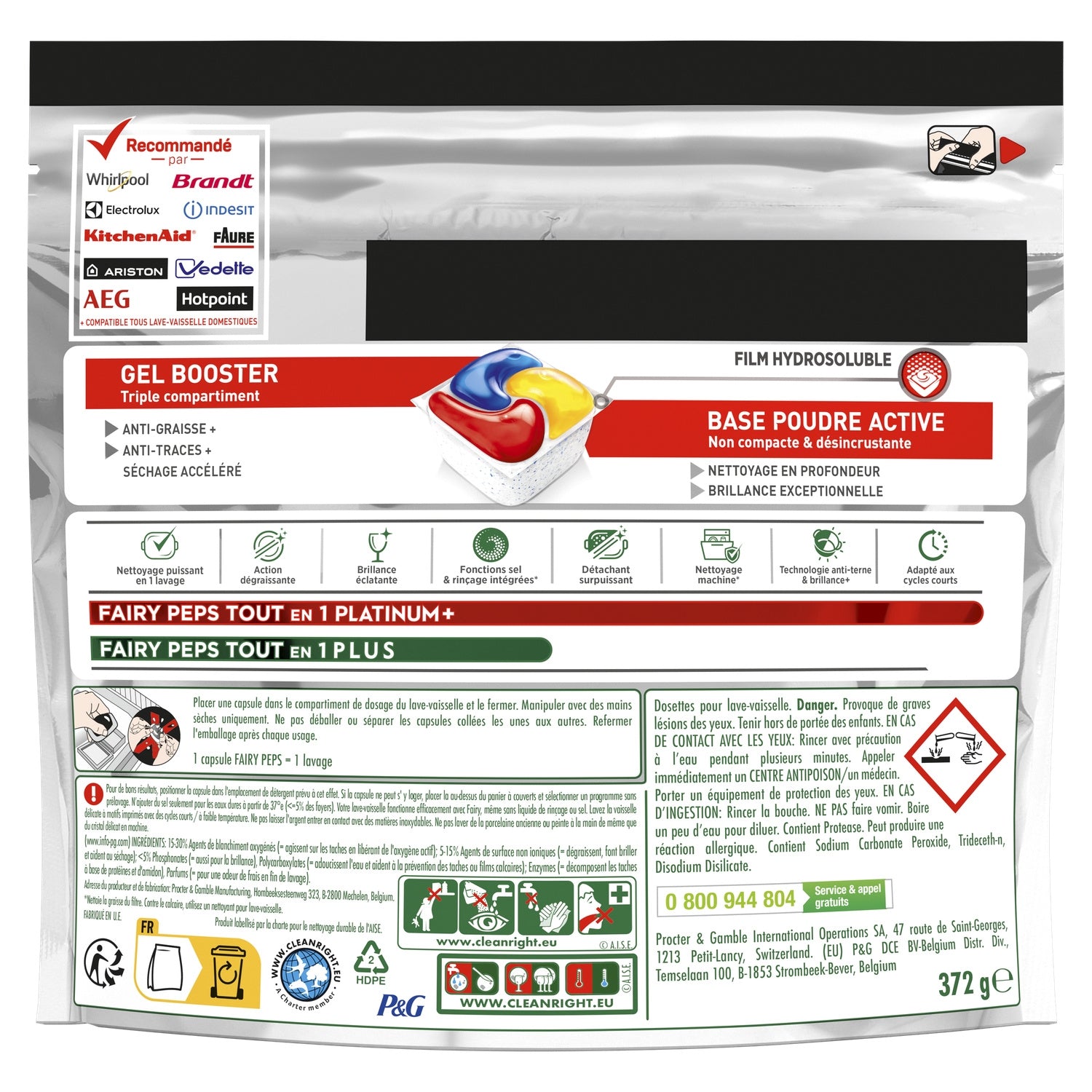 Fairy Platinum Plus All-in-One dishwasher tablets clean for dishes like new. They deliver optimal Fairy cleaning action and eliminate the dull appearance that sets in over time, leaving dishes sparkling like the first day. Fairy Platinum Plus gives you exceptional cleaning that removes tough stains, even with extremely dirty dishes during a short cycle. Short on time? No worries. Opt for a short cycle. Fairy combines liquid and powder in powerful capsules. Their ultra-soluble sachet dissolves quickly and is suitable for short cycles, so you can start cleaning right away. And they're easy to use. No need to unwrap them, simply place them in your dishwasher detergent compartment. Opt for a short cycle* instead of a normal cycle and save time, energy, and water!