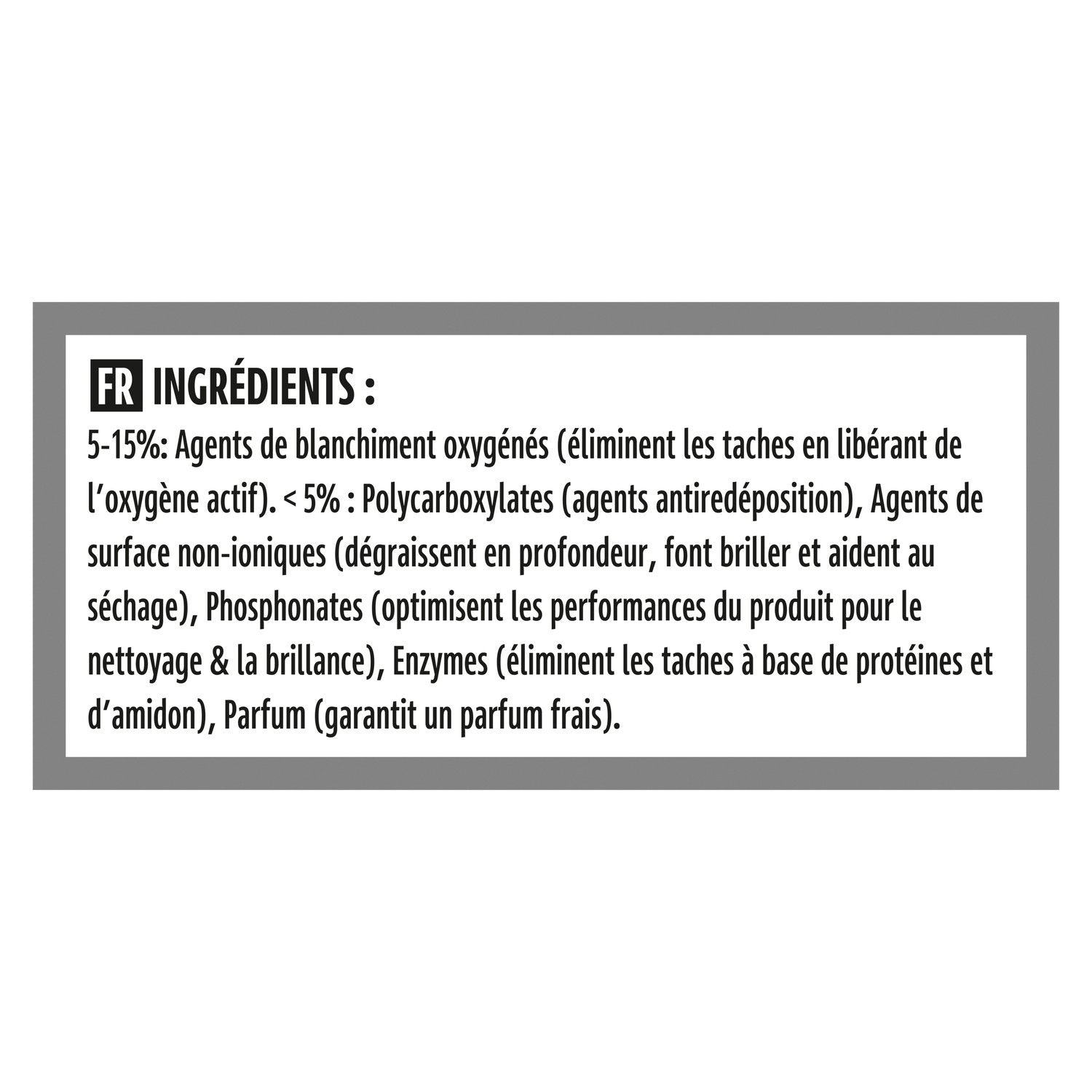 5-15%: Oxygenated bleaching agents <5%: Polycarboxylates, Non-ionic surfactants, Phosphonates, Enzymes, Perfume.