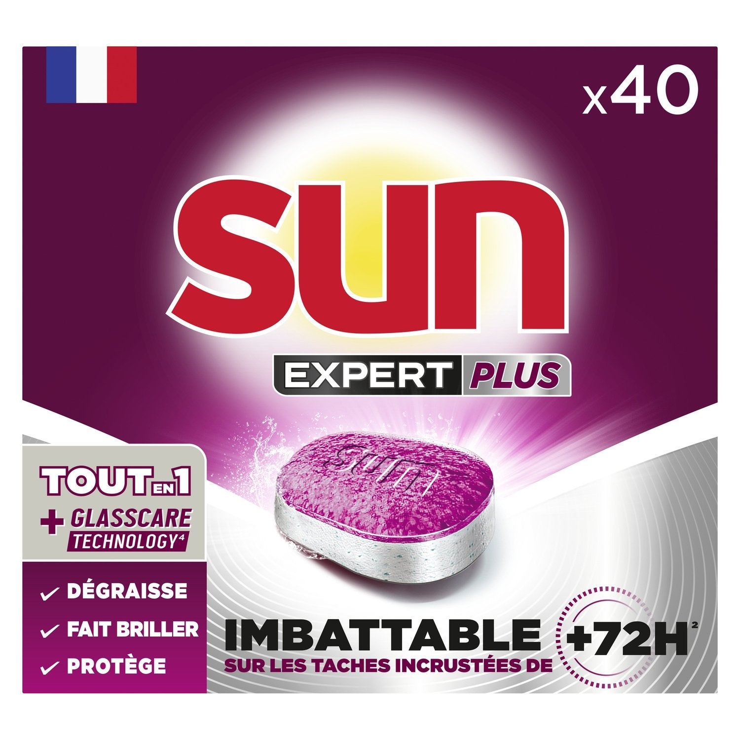 Sun's expertise with its Expert Plus range guarantees you more than perfect results for your dishes and your dishwasher for all your washes. Sun Expert Plus Regular 40 Washes dishwasher tablets offer you a complete washing solution in a single tablet. Enriched with degreasing and descaling agents, they are unbeatable¹ on stubborn stains, even those more than 72 hours old! These new dishwasher tablets degrease deeply, intensely shine and protect your dishes, and take care of your dishwasher wash after wash, without requiring a pre-rinse or adding additional products! To make our Expert Plus tablets even more effective, our formulation now includes GLASSCARE TECHNOLOGY² which protects the glass and prevents corrosion that forms when glass is repeatedly exposed to dirt and detergents. Sun dishwasher tablets are made in France and composed of at least 45% ingredients of natural origin. Practical, they are contained in water-soluble sachets that you do not need to remove. The cardboard packaging of this dishwasher product is made of 90% recycled cardboard and is recyclable. Remember to close it after each use to protect your tablets from moisture. To take care of your dishwasher, also discover our Sun Deep Cleaning dishwasher product. For more than 60 years, Sun has been innovating to offer you more effective products, while improving its formulas to contribute to a more sustainable lifestyle (dishwasher capsules, dishwasher tablets, regenerating salt, etc.). Our Clean Future strategy aims to adapt and transform our factories, our production processes and our packaging to be more respectful of the environment, without compromising on the performance of our products, which remains our priority! ¹ Sun Expert plus unbeatable on stubborn stains, on the dishwasher tablet market, external test IKW 2023; on stains of + 72H, internal test 2023. ² Glass protection technology.