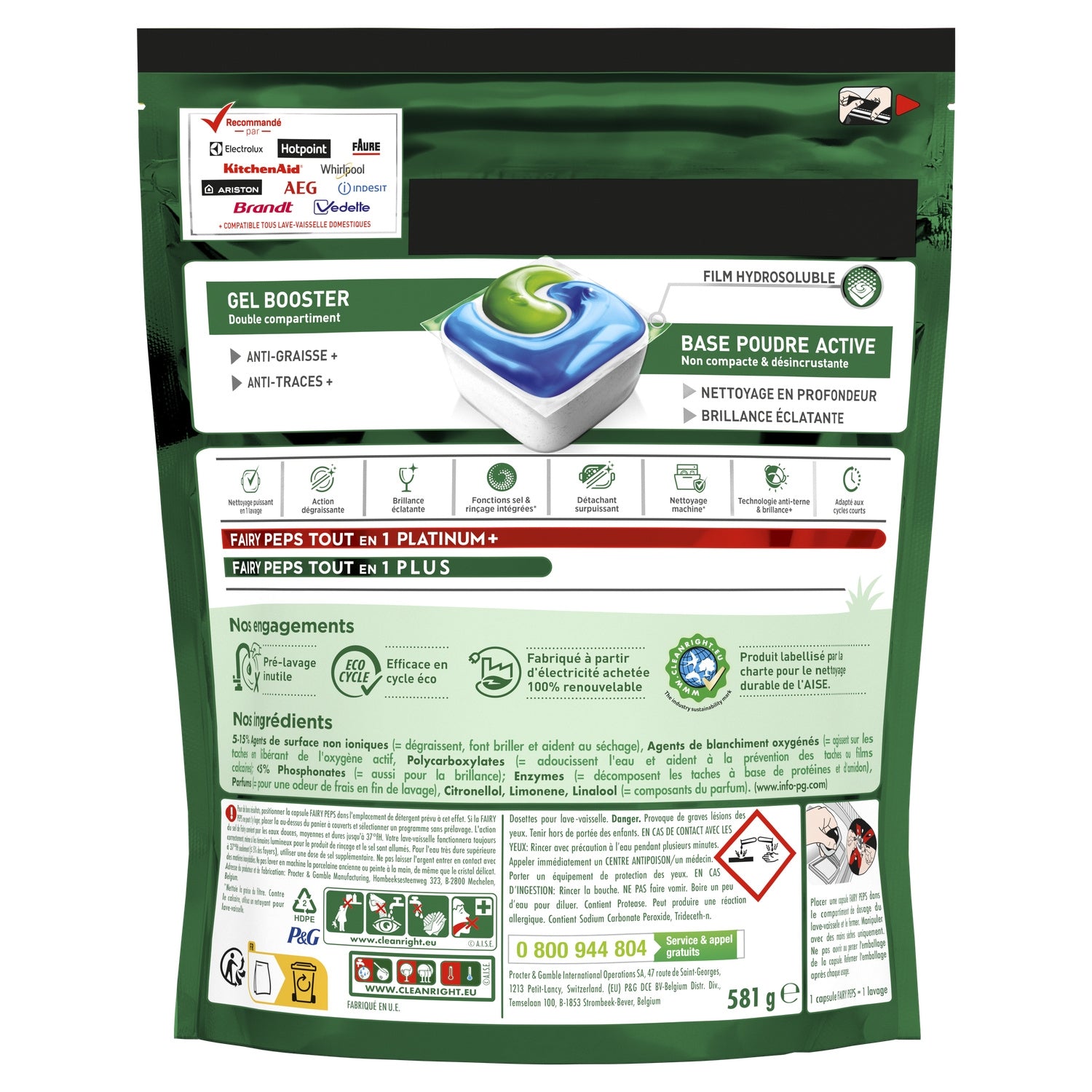 Fairy Original capsules clean from the first wash. They are even effective on stubborn grease. Integrated salt and rinse aid action, including glass and silver protection. For a dishwasher that is always clean and free from unpleasant odors. The ultra-soluble capsule dissolves quickly. Our production is carried out with 100% purchased renewable electricity.