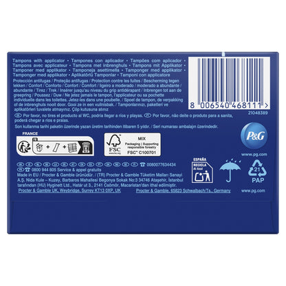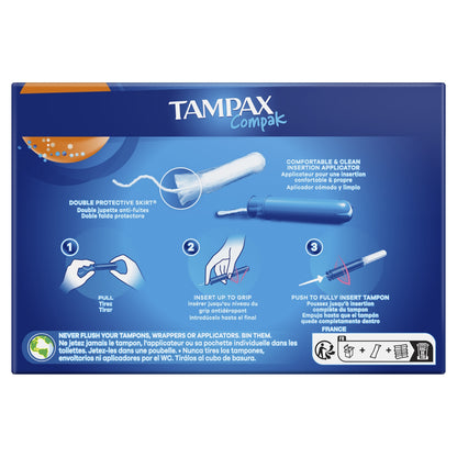 Tampax Compak tampons offer comfortable period protection,Plastic retractable applicator for easy insertion,Double protective skirt to help prevent leaks,Absorption channels to retain flow inside the tampon,Fragrance-free,Comfortable and clean insertion,Standard 100 certified and independently tested by Oeko-Tex for the presence of undesirable substances,Gynecologically tested
