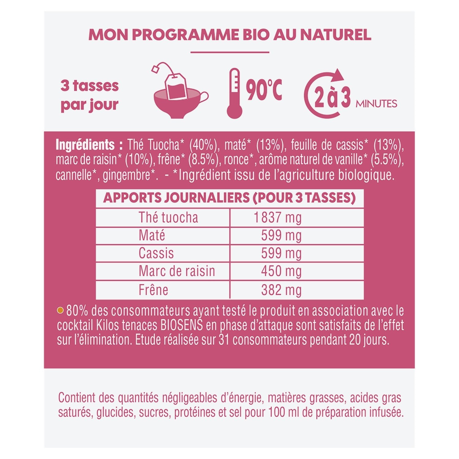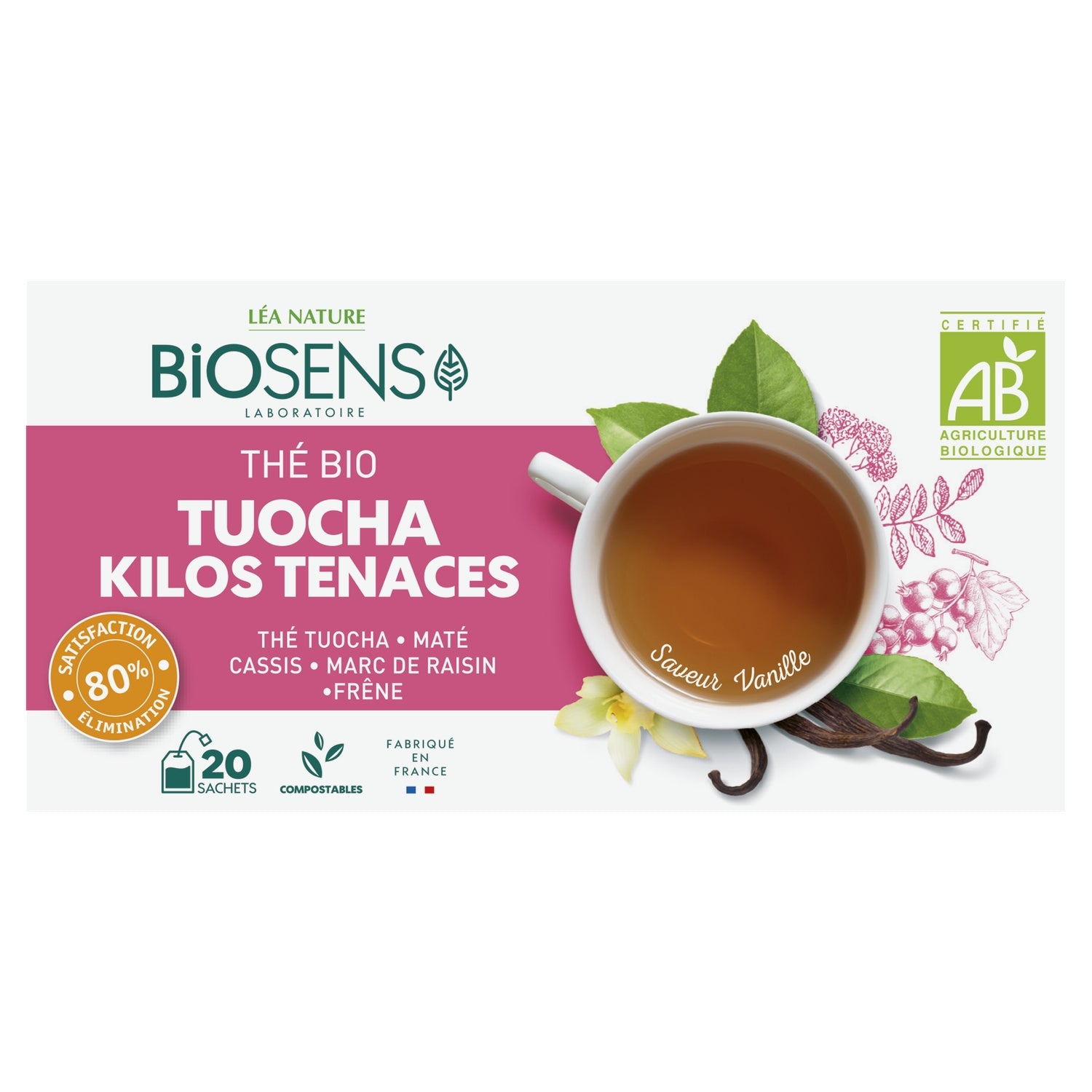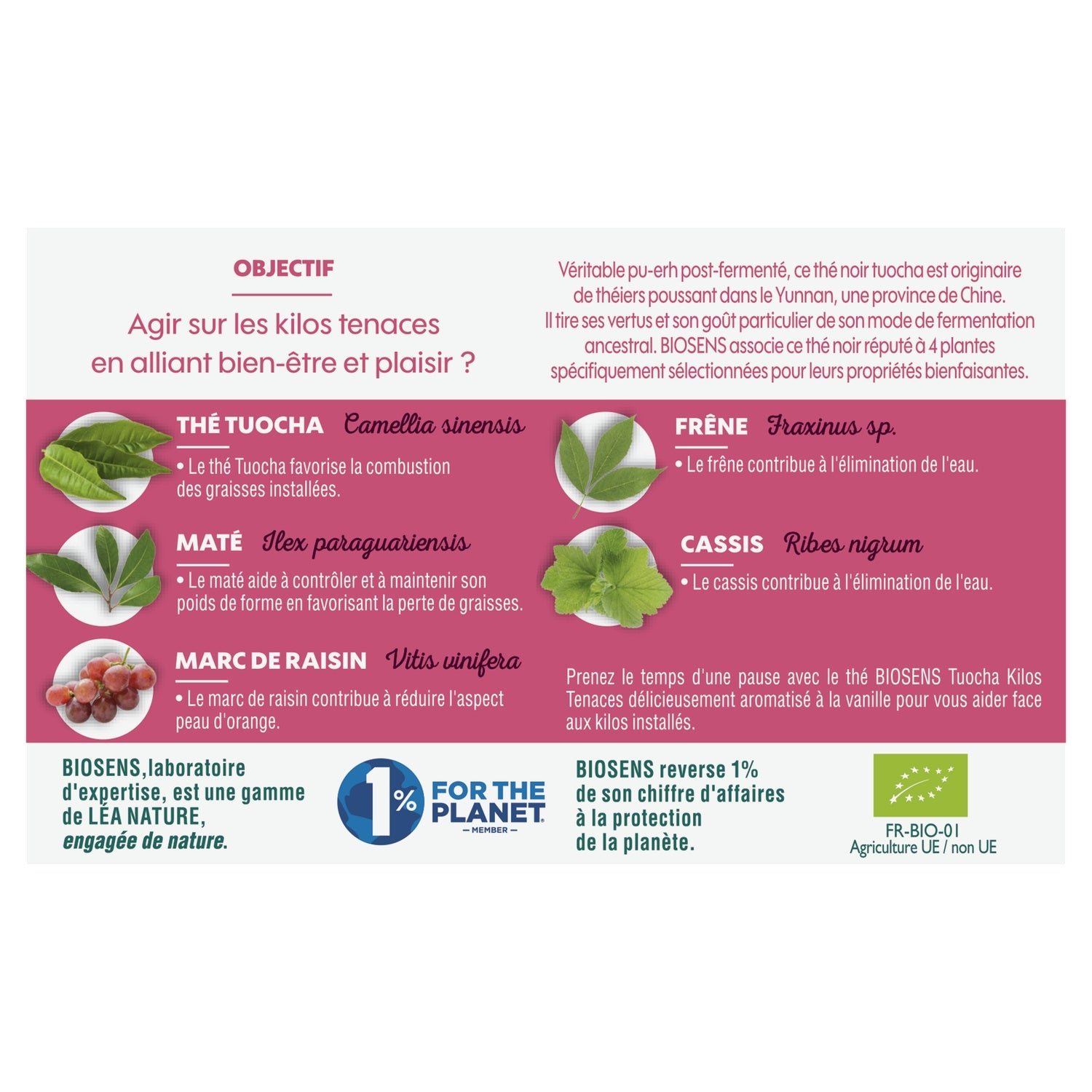 BIOSENS Tuocha Tea for Stubborn Weights 20 Compostable Bags Take a break with BIOSENS Tuocha Tea for Stubborn Weights, deliciously flavored with vanilla to help you cope with those extra pounds. Tuocha black tea, a true post-fermented pu-erh, comes from tea plants growing in Yunnan, a province in China. It derives its virtues and unique flavor from its ancestral fermentation method. BIOSENS combines this renowned black tea with 4 plants specifically selected to promote the burning of stubborn fat and help you maintain your ideal weight. Tuocha tea: promotes the burning of stubborn fat. Mate: helps control and maintain your ideal weight by promoting fat loss. Grape pomace: helps reduce the appearance of orange peel skin. Ash: helps eliminate water. Blackcurrant: helps eliminate water. 80% of consumers who tested the product in combination with the Bio Tuocha cocktail for stubborn weights BIOSENS in the attack phase are satisfied with the effect on elimination. Study carried out on 31 consumers over 20 days. Measured Effectiveness: 80% Satisfaction Elimination Made in France Compostable bags Compostable film Recyclable packaging BIOSENS donates 1% of its turnover to protect the planet. ORGANIC Vanilla Flavor