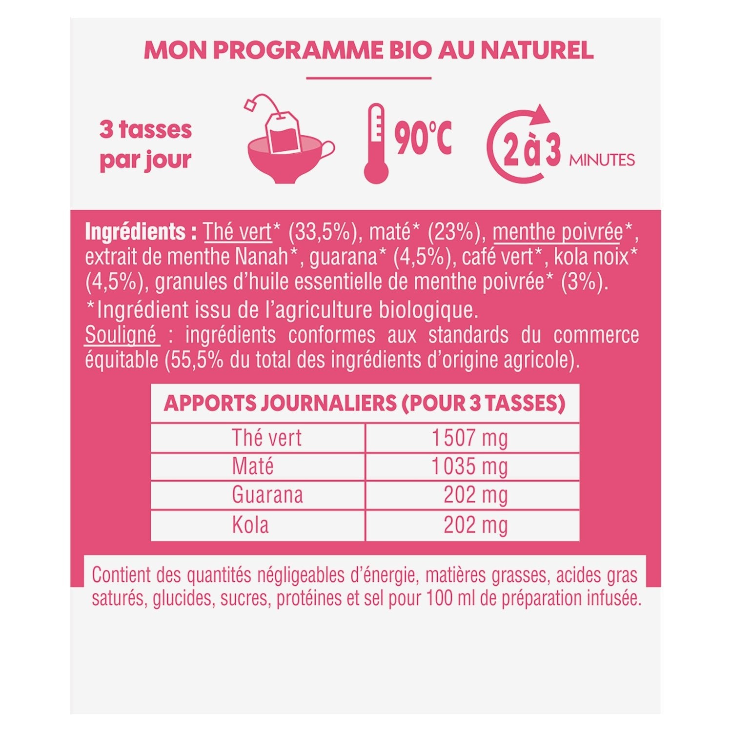 Ingredients: Green tea* (33.5%), mate* (23%), peppermint*, Nanah mint extract*, guarana* (4.5%), green coffee*, kola nut* (4.5%), peppermint essential oil granules* (3%). *Ingredient from organic farming. 55.5% of the total ingredients of agricultural origin comply with Fair Trade standards (green tea and peppermint)