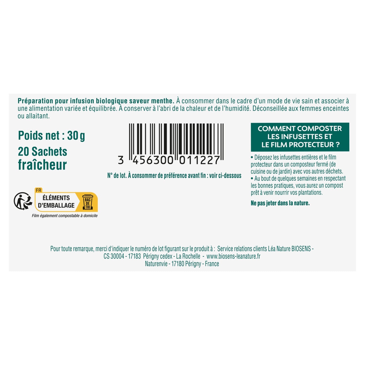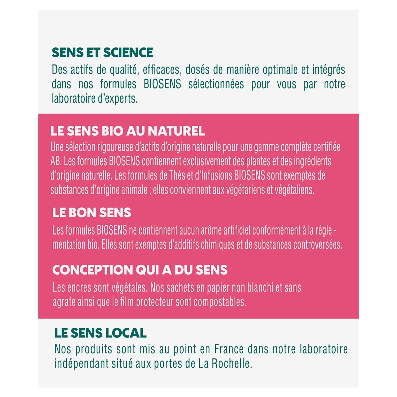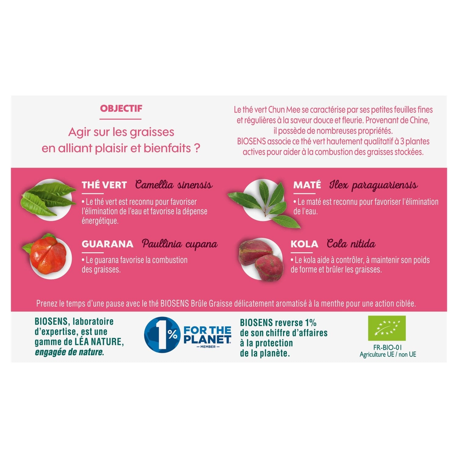 BIOSENS Fat Burning Tea 20 compostable bags Take a break with BIOSENS Fat Burning tea, delicately flavored with mint for targeted action. Chun Mee green tea is characterized by its small, fine, regular leaves with a sweet, floral flavor. Sourced from China, it has many properties. BIOSENS combines this high-quality green tea with 3 active plants to help burn stored fat. Green tea: known to promote the elimination of water and promotes energy expenditure. Guarana: promotes fat burning. Mate: helps control and maintain a healthy weight. Kola: helps control and maintain a healthy weight. Made in France Compostable bags Compostable film BIOSENS donates 1% of its turnover to protect the planet. ORGANIC Mint Flavor