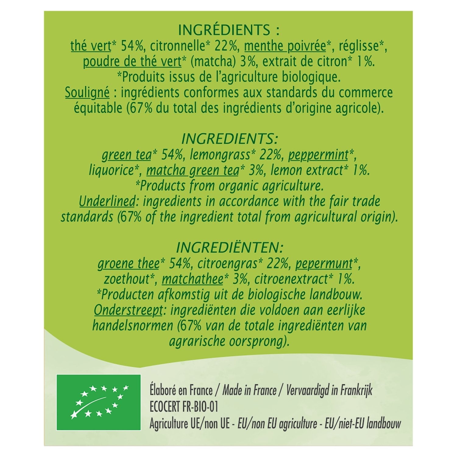 INGREDIENTS: Green tea* 54%, lemongrass* 22%, peppermint*, licorice*, green tea powder* (matcha) 3%, lemon extract* 1%. *Products from organic farming. 67% of the total ingredients of agricultural origin comply with Fair Trade standards (green tea, peppermint, green tea powder).