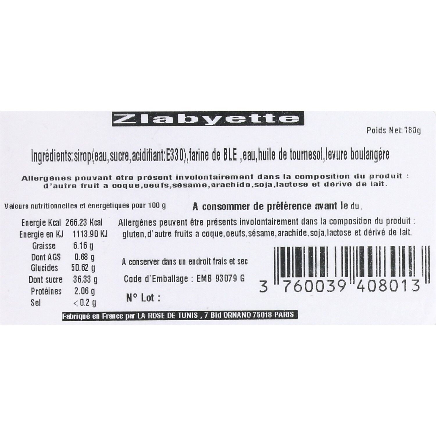 Syrup (water, sugar, acidifier: E330), WHEAT flour, water, sunflower oil, baker's yeast. Allergens that may be present unintentionally in the composition of the product: other NUTS, EGGS, SESAME, PEANUT, SOY, lactose and MILK derivatives. In the case of manufacturing and/or handling in store, staff handle the following allergens in their workshops: Cereals containing GLUTEN - EGG - FISH - PEANUT - SOY - MILK - NUTS - MUSTARD - SESAME SEED - SULFITE. We cannot also exclude the contamination of raw materials in LUPIN and CELERY.