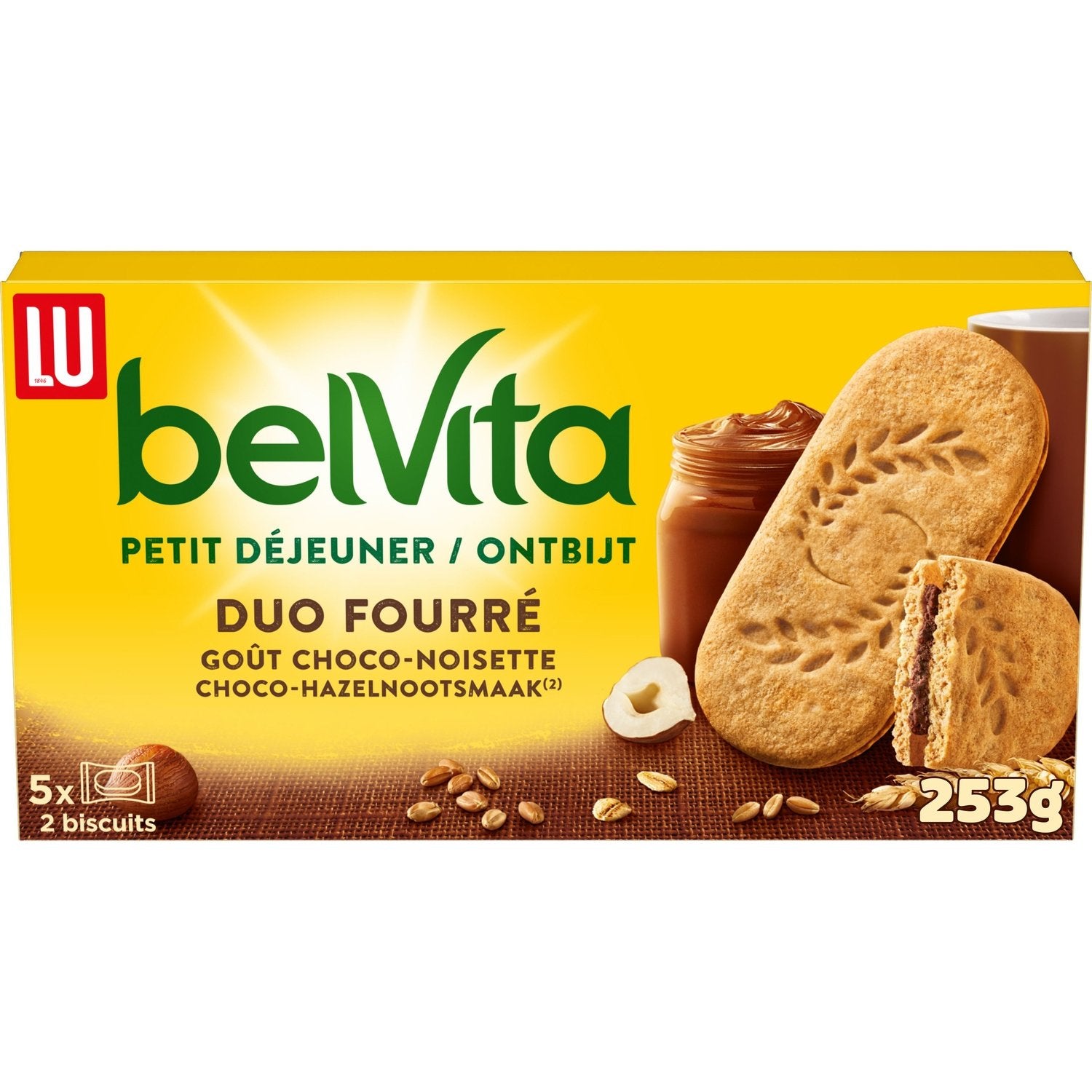 BelVita Breakfast Biscuits - a crispy biscuit with 5 whole grains; 5 individual bags of 2 biscuits,With their delicious chocolate-hazelnut filling, the whole family, adults and children alike, will start the day in a good mood,These biscuits contain 5 carefully selected whole grains.,Enjoy BelVita as part of a complete breakfast with a dairy product, fruit and a hot drink,Discover our wide range of breakfast biscuits with crispy or soft textures