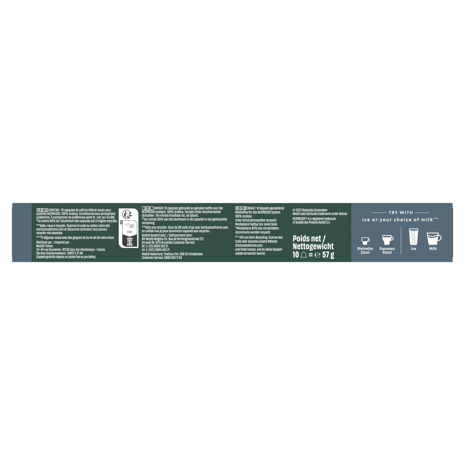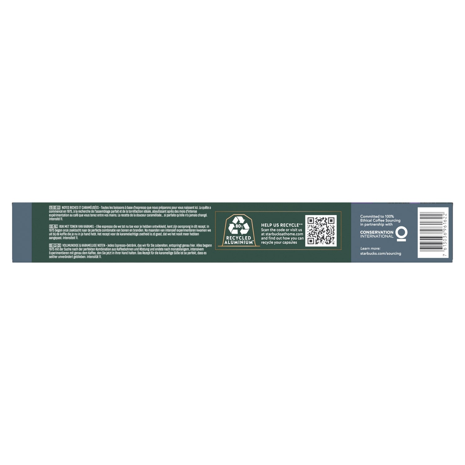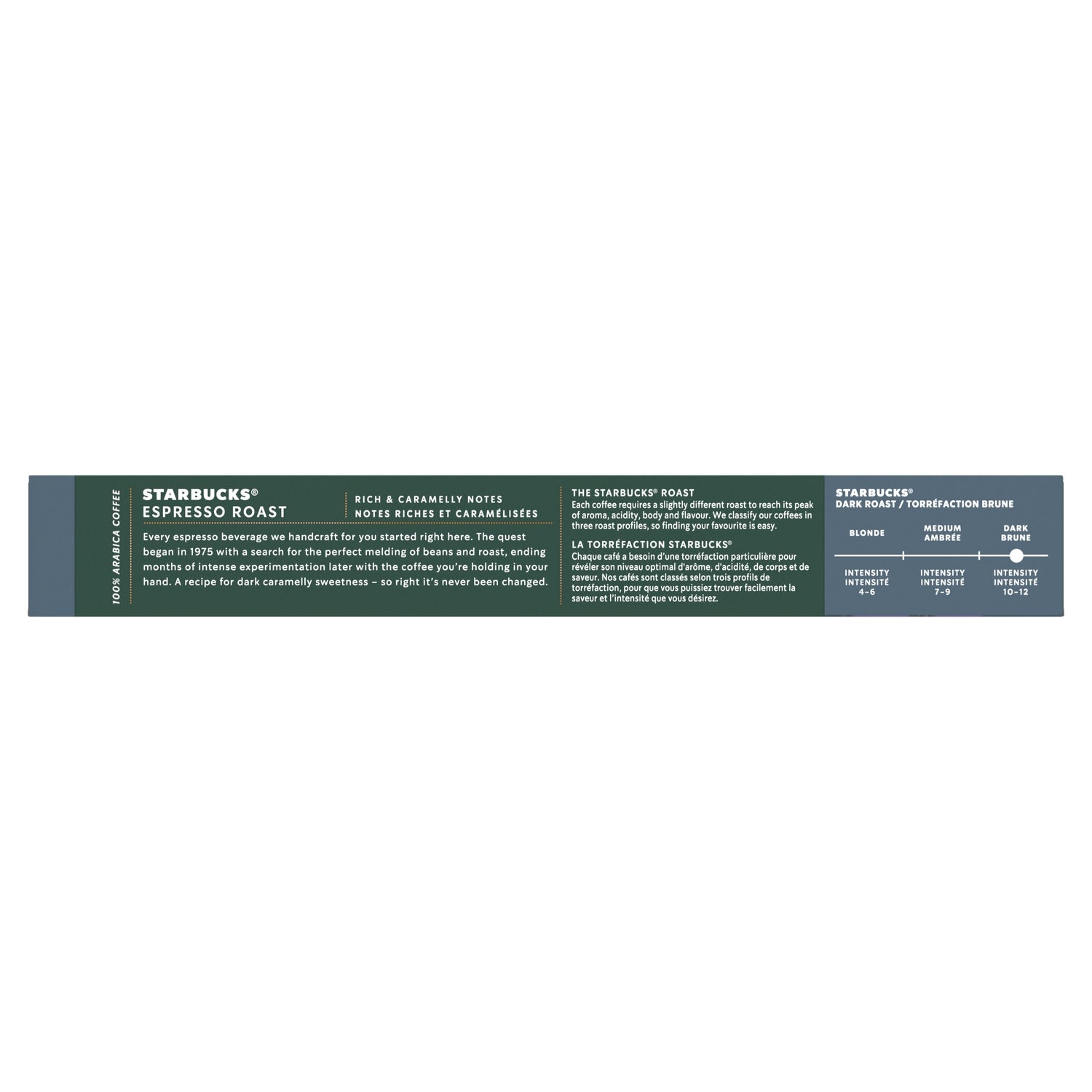Discover STARBUCKS Espresso Roast capsules by NESPRESSO, a 100% pure Arabica coffee to prepare at home with your NESPRESSO machine. A dark roast that produces a rich and intense cup with caramelized notes. A box containing 10 capsules allows you to prepare 10 cups of STARBUCKS Espresso Roast coffee. Intensity 11.