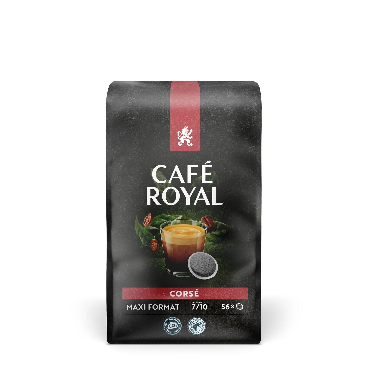 Our Café Royal Corsé is a spicy lungo with a bold flavor. Its delicate cocoa notes give it a unique sophistication. It is sustainably produced and has received the Rainforest Alliance seal of approval.
